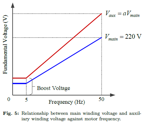 Lemértem, és a kisérleti 750W-os IMI motornál a segédfázis feszültség kondenzátorral használva kb. 1,3x nagyobb mint a hálózati feszültség. Tehát kondenzátor nélkül oda kb. 300Veff-et kell adni. De nehezíti a dolgot, hogy ez még motoronként más ás más.