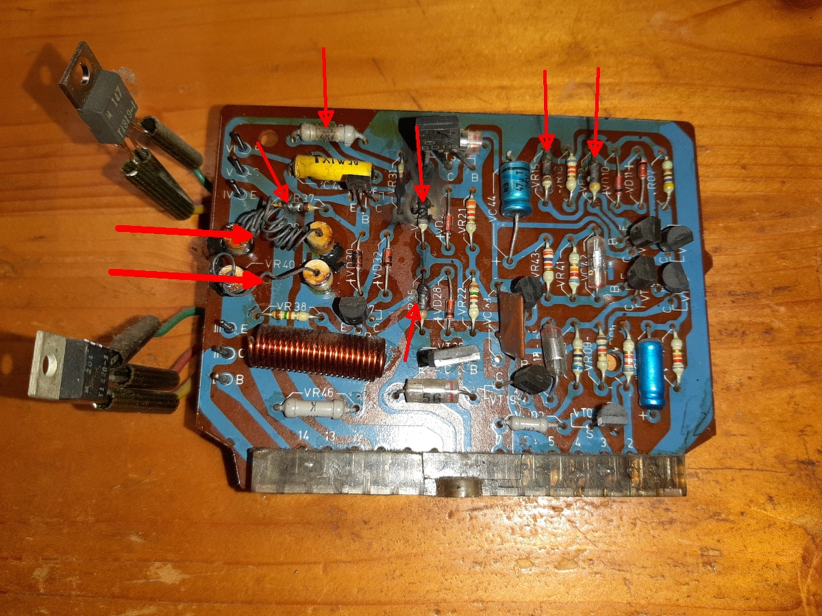 Alig maradt ép alkatrész. Tranyók VT16-tól felfelé. A T6, 8, 14 talán megúszta. A diódák java része cserés, legyen kéznél 6 db 1N4148, ne kelljen kétszer boltba menned