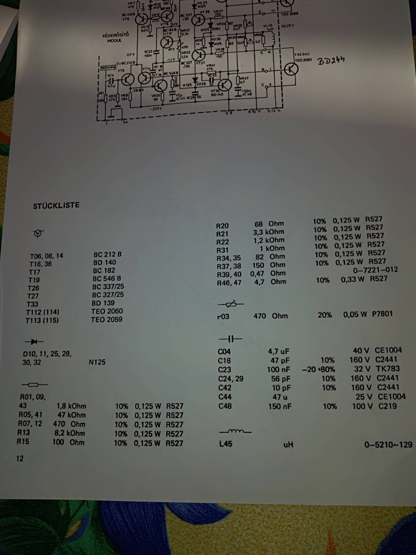 Elkezdtem kiszámolni az ellenállás terhelését és az a meglepetés ért, hogy a 0,47 Ω emitter-ellenállás és a VR (1)31, (1)37, (1)38 1k illetve 150 Ω értékekből irreális áramkorlátozás jön ki. Nem meglepő, ha rajzi hibával állunk szembe, de akár a 0,47 Ω is el lehet írva.
