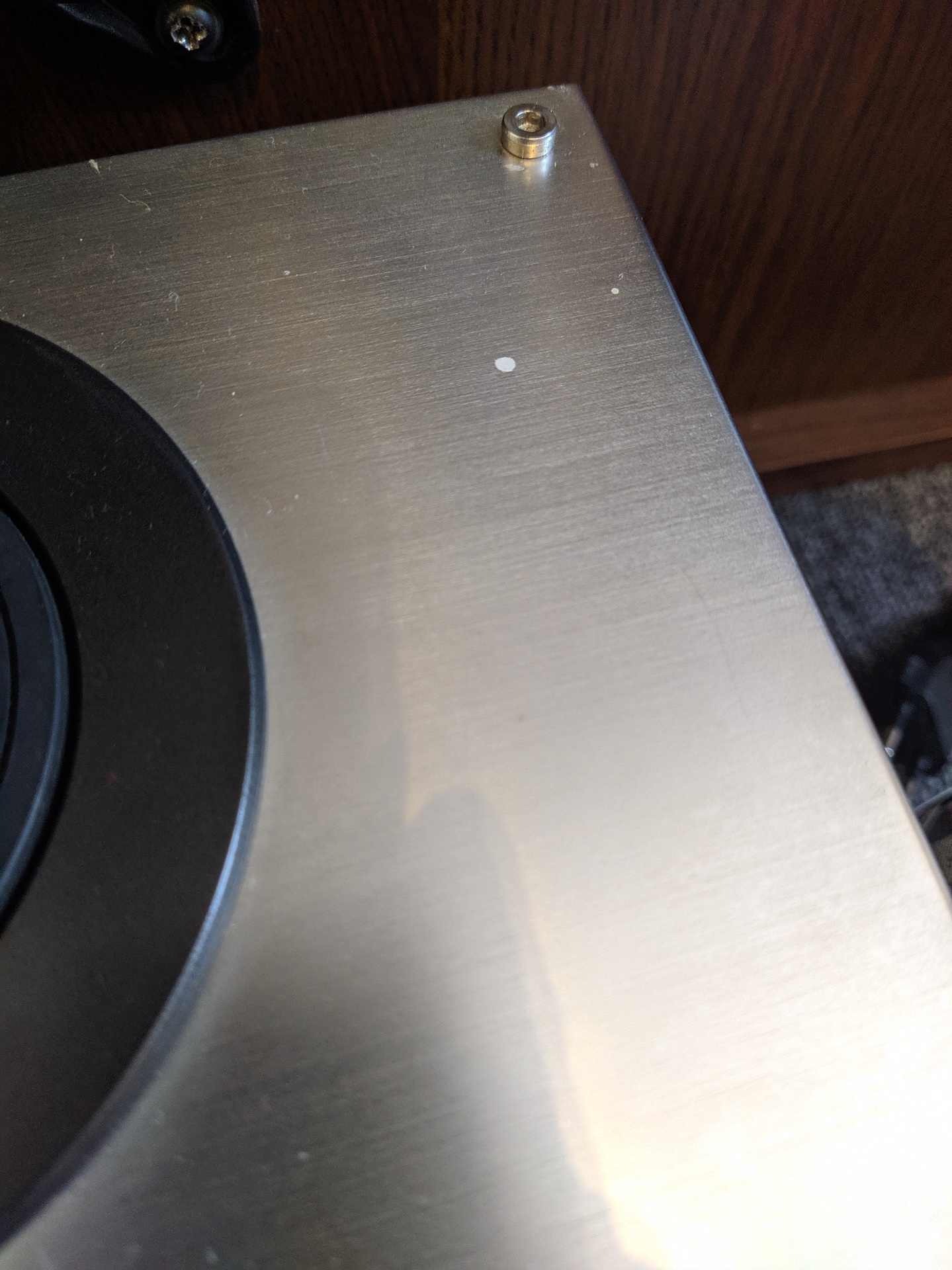 Ez agy szálcsiszolt, alumíniumnak (acél?) tűnő felület. Nagyon kényes. A folt nem valami savas, vagy lúgos anyag hatása?