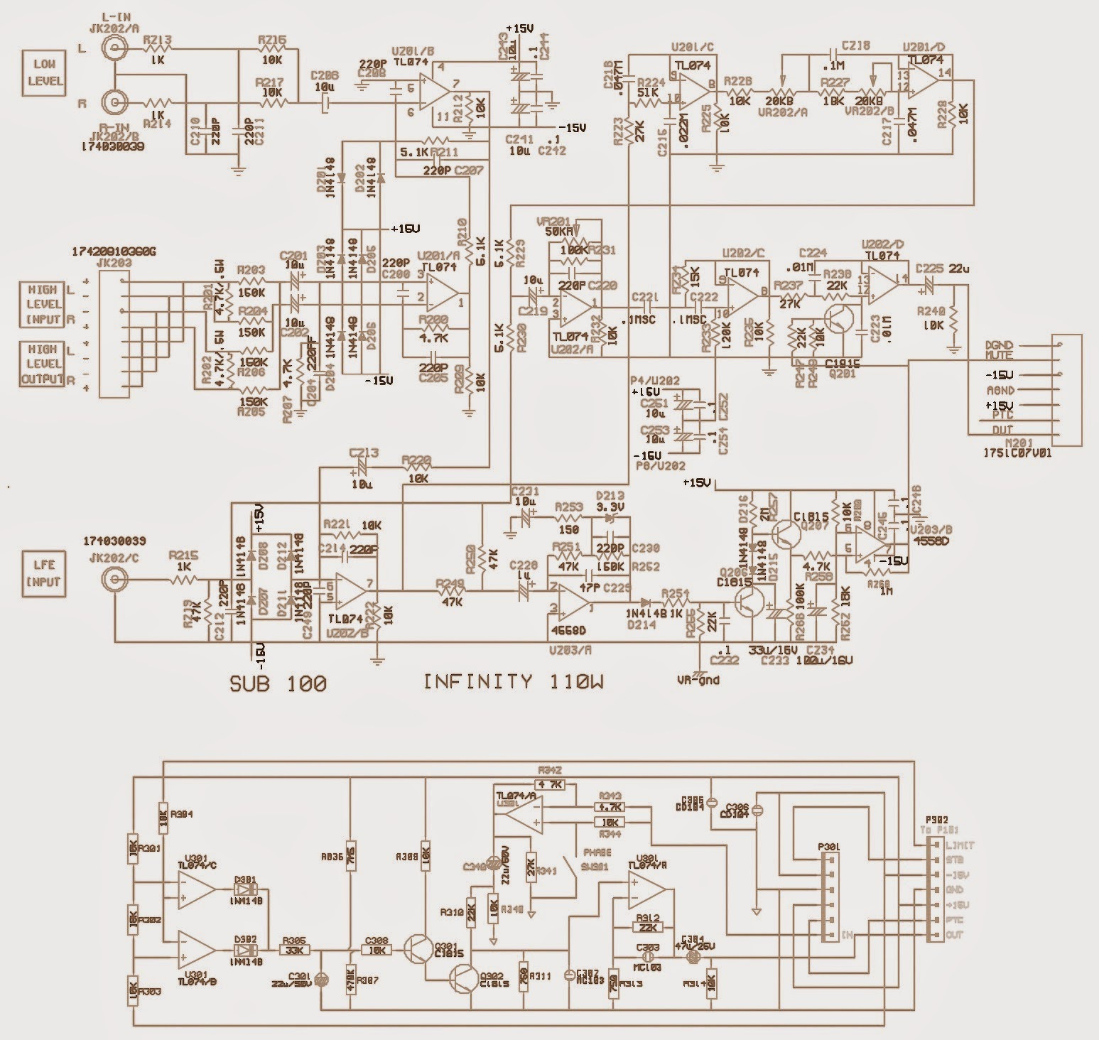 Sziasztok! Kérdésem lenne, hogy adott egy JBL SUB 140/230 típusú aktív mélyláda. A tünet az volt hogy nagyon halkan szól, gyakorlatilag inkább nem. A limiter áramkörében van a probléma, kicseréltem a tl074-es ic-t (a két 1815-ös jó) azonban a csatolt képen látható helyeken lévő feszültség miatt Q302 letesteli a jelet ezért nem szólt. Arra nem tudok rájönni hogy kerül Q301 bázisára 3,27V feszültség amikor nem kéne. Gyors megoldásként annyit csináltam, hogy kiforrasztottam Q302-t így kikötve a limitert, így szól rendesen az lenne még a kérdés ez mennyire lehet probléma?