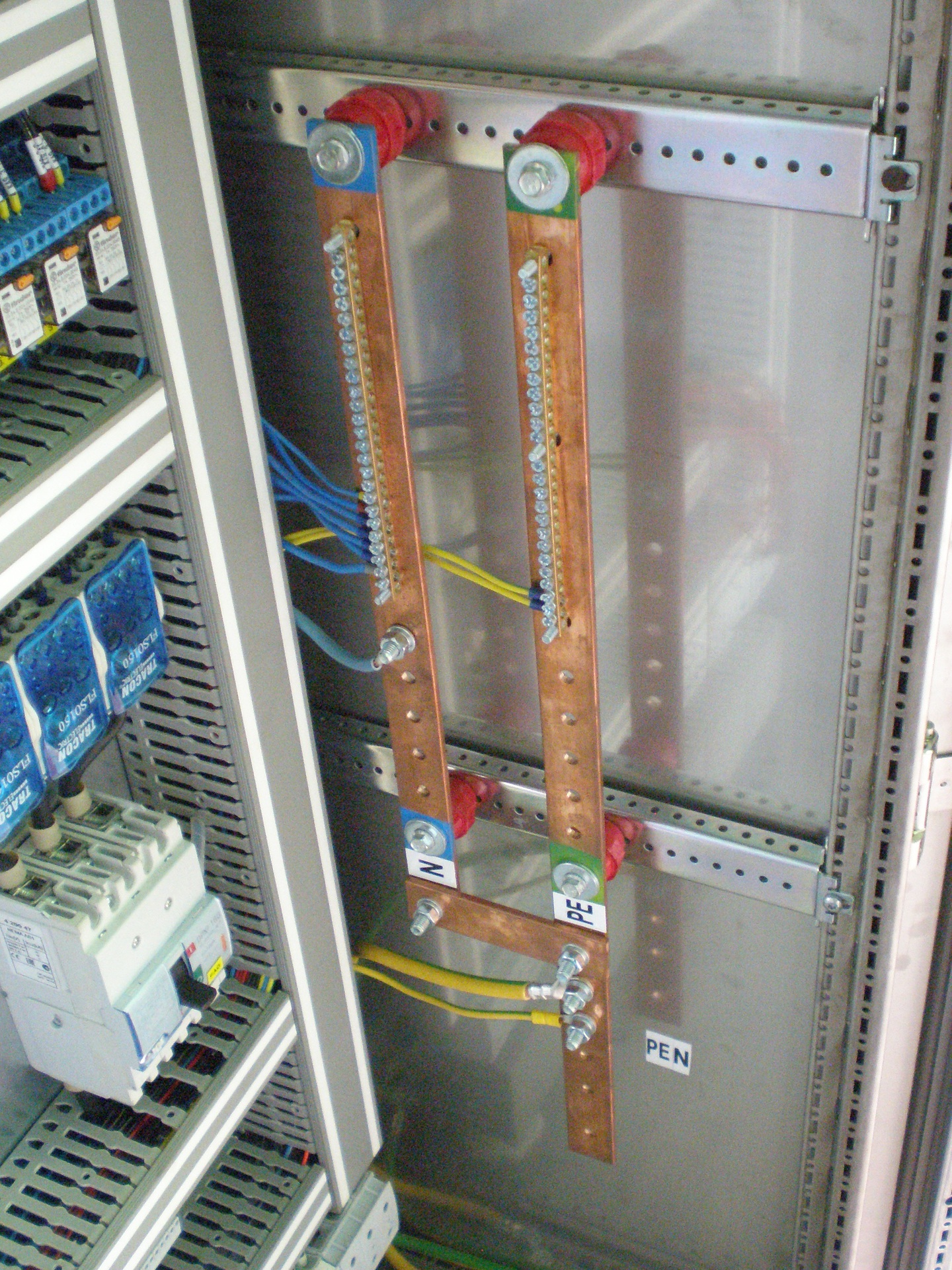 Idézet: „a PE és N vezetők esetleg már a ebben főelosztóban külön sínt kapnak. Ezt úgy illik megvalósítani, hogy a betáp PEN-vezetők ugyanarra a fizikai síndarabra csatlakoznak, mint az elmenő PE-k a kettő közti elméleti határvonalat az ezt a sínt az N-sínnel összekötő síndarab/vezeték – ami ugye a PEN-bontást valósítja meg – jelenti. Elméletileg a sínnek az átkötéstől a betáp kábelvégek felé eső fele PEN-, az elmenő PE-k felé eső része viszont már csak PE-sín.” Kerestem fényképet a leírásodhoz, csak hogy jobban el tudják képzelni az olvasók. Kisáramú esetre is mutatok megoldást. A leírásodhoz annyit tudnék hozzáfűzni, hogy erre a szétválasztási pontra földszondát kell csatlakoztatni, hogy az esetleges bejövő PEN szakadása esetén az biztosítja a szétválasztási pont földhöz közeli potenciálját. Én három fázisú rendszerek esetén HRN-54N típusú feszültség figyelő relét szoktam használni a nullszakadás figyelésére, úgy kell bekötni, hogy a főmegszakítóba épített feszültségcsökkenésre reagáló kioldótekercset működteti (elbontja a tápfeszültségét). Ezesetben a főmegszakító kiold és csak manuálisan lehet visszakapcsolni (nem automatikus), természetesen csak azután, hogy a kioldás okát megtaláltuk. A hozzászólás módosítva: Jan 10, 2021