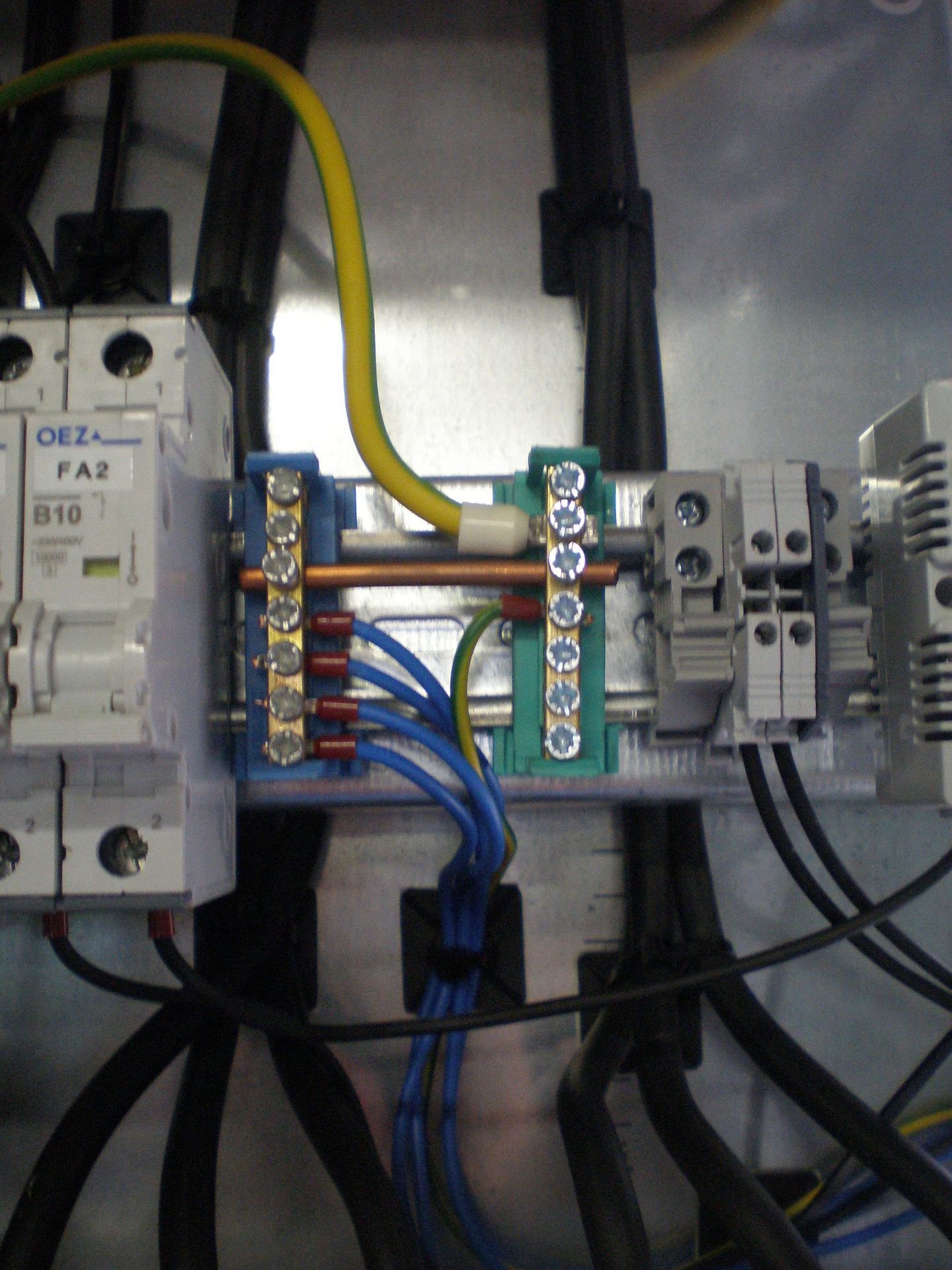 Érdekességként mutatok egy 1500A-es FI-relét. A jobb alsó sarokban van a mérőtekercs, a bal felső sarokban a kiértékelő, a kapcsolásról pedig a bal oldali OEZ BL1600 gondoskodik. A jobb felső sarokban OEZ túlfeszültségvédők vannak. Ez egy porrobanásra veszélyes hely főelosztója, ez a FI relé 300mA hibaáramnál old ki, tűzvédelmi okokból lett alkalmazva. A jobb oldali OEZ BL630 a meddőteljesítmény kompenzációs szekrény betápja, ezért van a FI relé előttről lekötve. Sajnos a PEN szétállásról nem találtam fényképet. Amúgy 100x10mm-es rézsínre csatlakozik a bejövő PEN, ami megszakítás nélkül fut tovább mint PE, a FI relé előtt leágazik róla 4 szál ezüstözött 150mm2-es sodrott rézdrót ami miután át lett vezetve a FI-relé mérőtekercsén csatlakozik a szintén 100x10mm-es sínre (az átvezetés nem látható a képen, az később lett beszerelve).