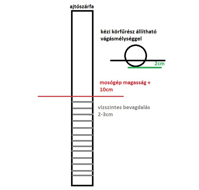 - feljelölném a mosógép magasságát +10cm - egy állítható vágásmélységű kézi körfűrészen beállítanám a 2cm-es vágásmélységet - 1-2cm-es távolságban bevagdosni a szárfát - egy szélesebb és éles vésővel simán ki lehet ütni a kis darabokat (gondolom a tok anyaga fenyő) - némi csiszolás után egy adott méretre vágott 2cm vastagságú deszkával "visszapótolható" a hiányzó rész. (ha csavarral rögzíted akkor legközelebb könnyebb lesz leszedni.