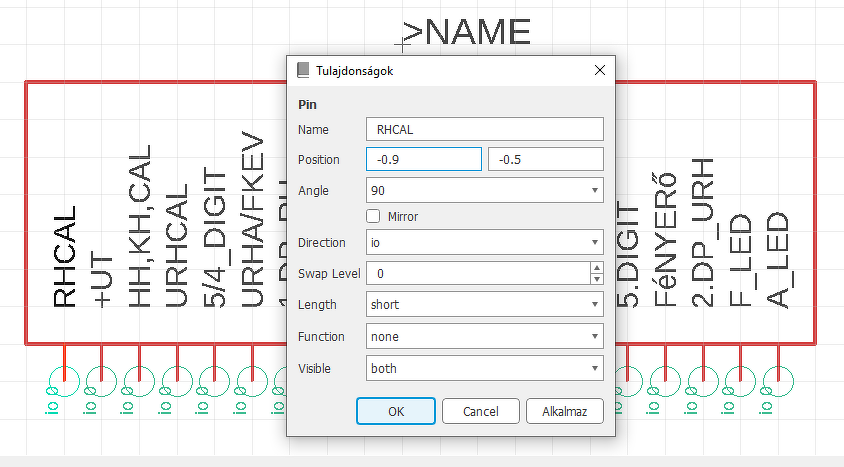 Sajnos nem értettétek meg a problémámat, vagy én nem értettem meg a megoldást. 1. A "NAME" opcióban megjelenő adat a kivezetés tokon belüli funkciójára utal, nem pedig a lábszámra. Az én esetemben pl.: az 1. láb neve: RHCAL. Ezt nem írhatom át, mert ez a neve. 2. Ha a "Visible" opcióit megváltoztatom, akkor: "PAD" esetén eltűnik a láb neve ("NAME"), és marad a P$1. Ha "PIN" opciót választom, akkor megmarad a "NAME", eltűnik a P$, de azzal együtt az alkatrészláb számozása is eltűnik. Azt szeretném, hogy maradjon a "NAME", mint funkció, és maradjon a lábszámozás, de tűnjön el a P$. Érdekes módon egyéb tokoknál ez szinte automatikusan adódik, ennél viszont nem. Nos, ez a kérdés lényege, hogy miért, és mit tegyek, hogy ne így legyen? Remélem érthetően fogalmaztam.
