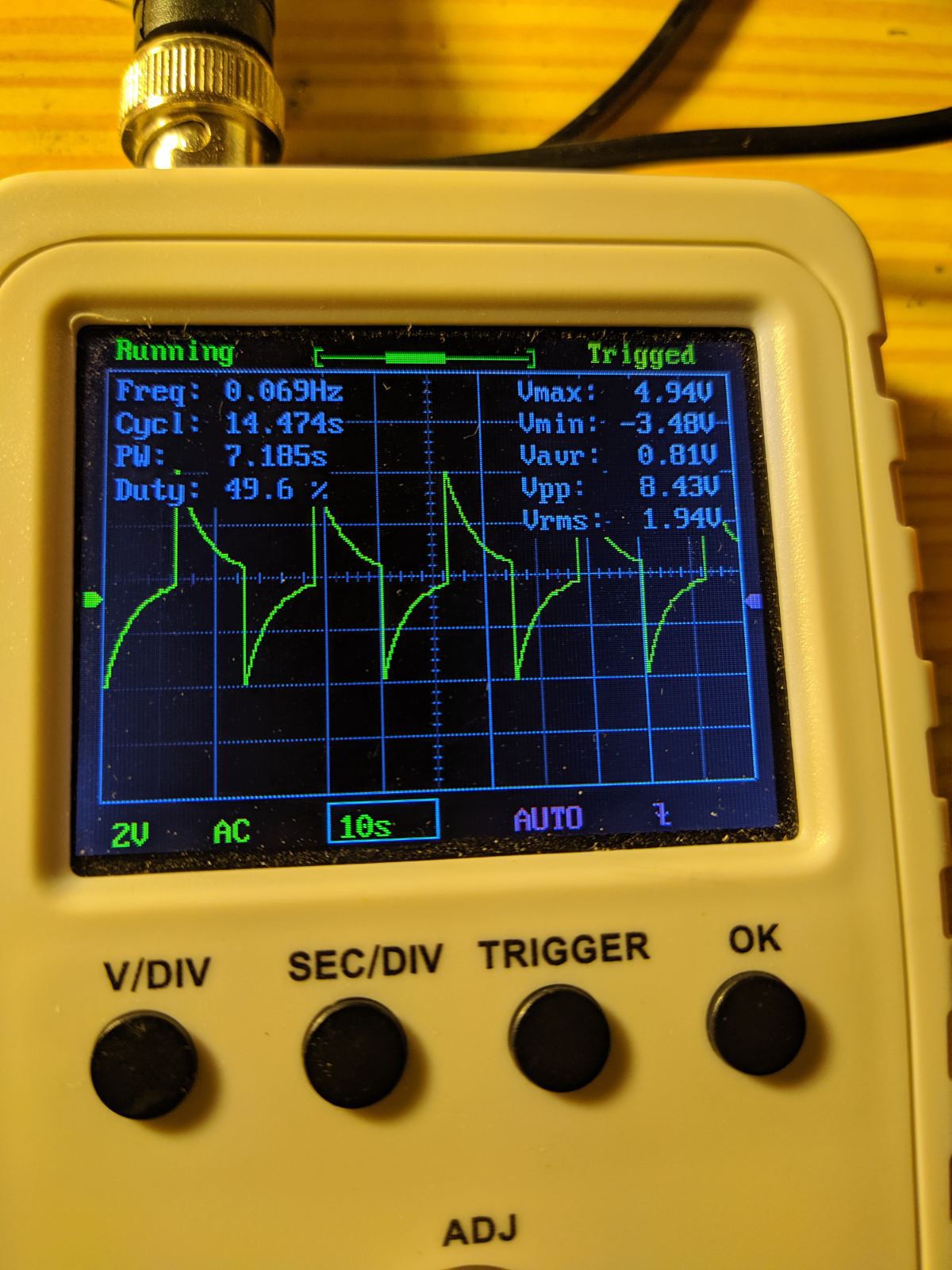 Az a soros kapacitás a szkóp AC csatolása lesz, szerintem. Ha megnézed, 10s/DIV a vizszintes eltérítés.