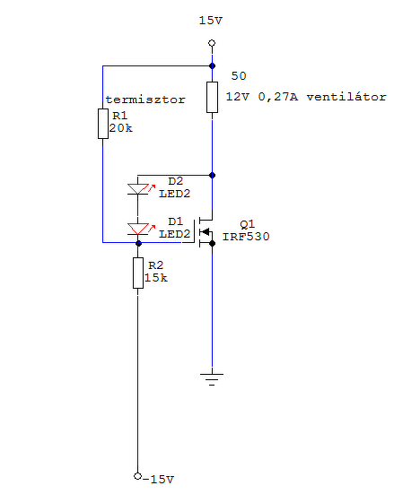 Egy keverőerősítőben mindig egyforma fordulaton ment a ventilátor. Sima 12V 0,27A-es van benne. Kicsit hangosnak tűnt, így kreáltam hozzá egy ilyen szabályzót. Adott volt a +/-15V, valamint még egy +15V a védelemnek. Erről megy a venti is. Eredetileg egy darab 27 Ohmos előtét ellenállás csökkentette a tápját 11-12V-ra. Ezek szerint nem is vesz fel 270mA-t normál üzemben. Egy NTC 20k termisztor volt kéznél,ennek volt csavaros felfogatója, de simán a 10k-s is megfelel, ha az R2-t felére vesszük. A két sárga led meg a fet UGS feszültsége adja hogy kb. 6V-al csökkenti a ventilátor tápfeszét. 40-45 Celziusz körül elkezd felpörögni a venti, és 5 Celziusszal magasabban már teljes sebességgel kotor. Ilyen időben egy próbahelyen döngettem, hát nem emelkedett a fordulat. Elég volt a lassú öblítés. Gondolom nyáron viszont jó lesz a tartalék. De most jó hogy nem hangos mint egy porszívó. A szellőző rések nagyon felerősítik az áramló levegő zaját. A 27 Ohm az bent maradt a ventilátorral sorosan, tehát nem fog többet kapni mint eredetileg.