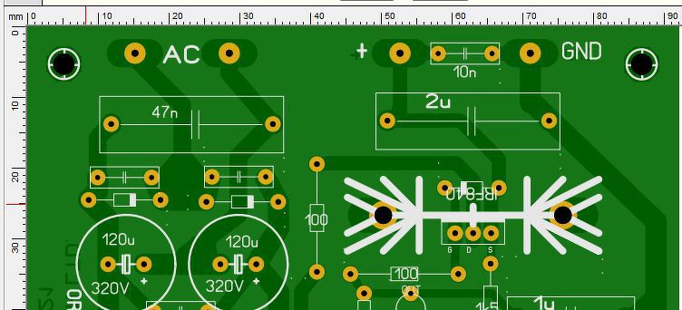 Egyébként nem okoz semmilyen problémát, már megszoktam, hogy így van. Sőt, mivel elfogadtam ezt a gyártói sajátosságot, most már igyekszem kihasználni, ami annyit jelent, hogy némi trükközéssel eltérő méretű PAD-et rakok a furat aljára és tetejére. Alul hagyom az egyoldalas panelre jellemző méretet, de felülre csak vékonyabb szegélygyűrűket rakok, így megkapom a lakkozásomat, van furatgalván ami stabilabbá teszi a beforrasztásokat, de nem zavarnak felül a nagy padméretek, és szép lesz a felirat.