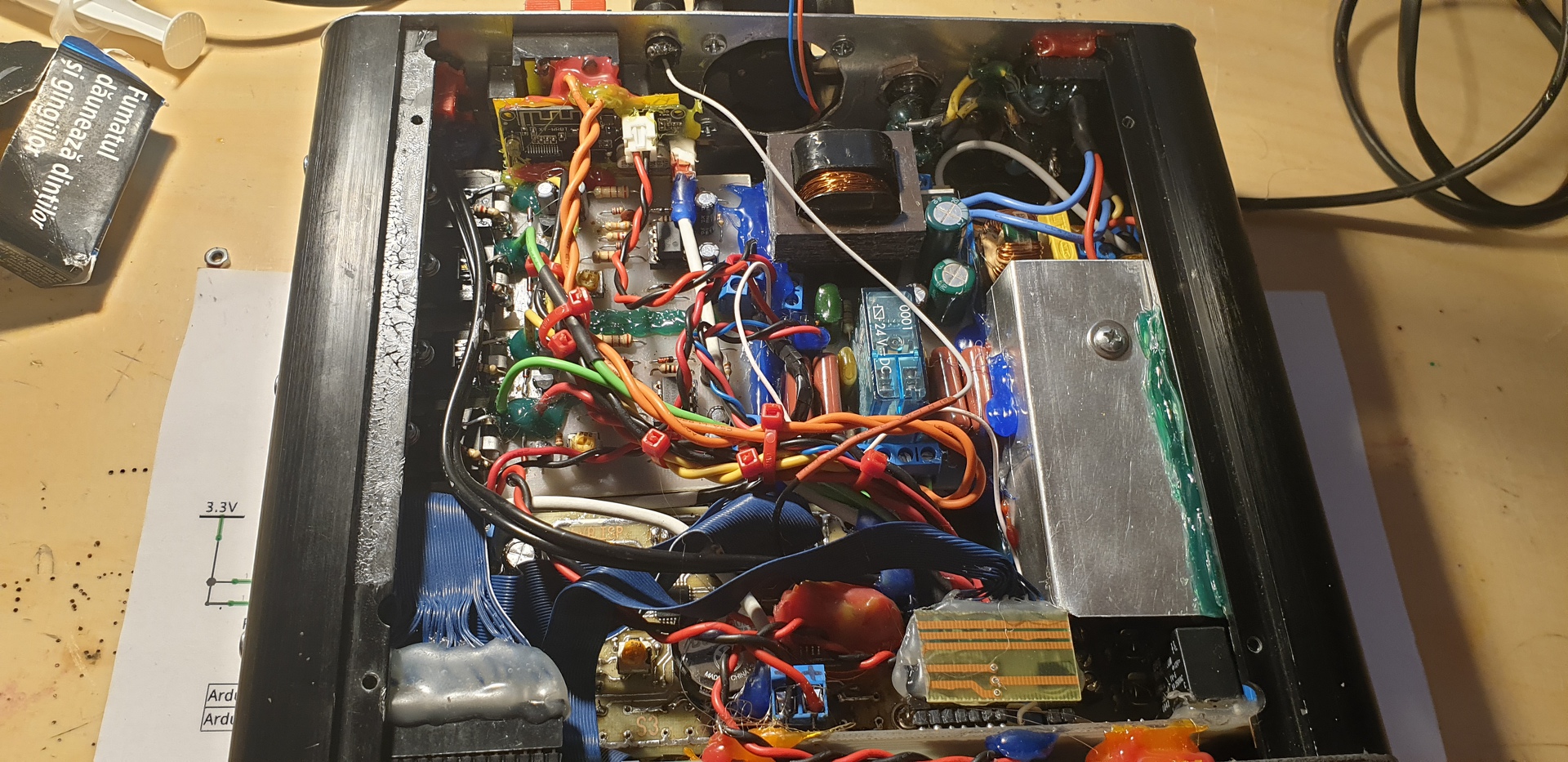meleg ragasztóra azért volt szükség, mert hely hiányában nem tudtam volna normálisan kialakítani a felfogatási pontokat némely nyákon. Belvilága azért kicsi a doboznak. Igen, Murphy úr jelen volt, a rádió modulból a működtető füstöt kiengedte, szerencsére egyebet nem bántott.Köszönöm Idézet: „Igen, Murphy úr jelen volt” Nem bántásnak szántam azt amit írtam. Mindenképpen szép munka, és nem semmi dolog hogy minden hely ki van használva. Kár hogy "Ő" működött, de jól kiszúrsz vele mert megjavítod. Akkor is