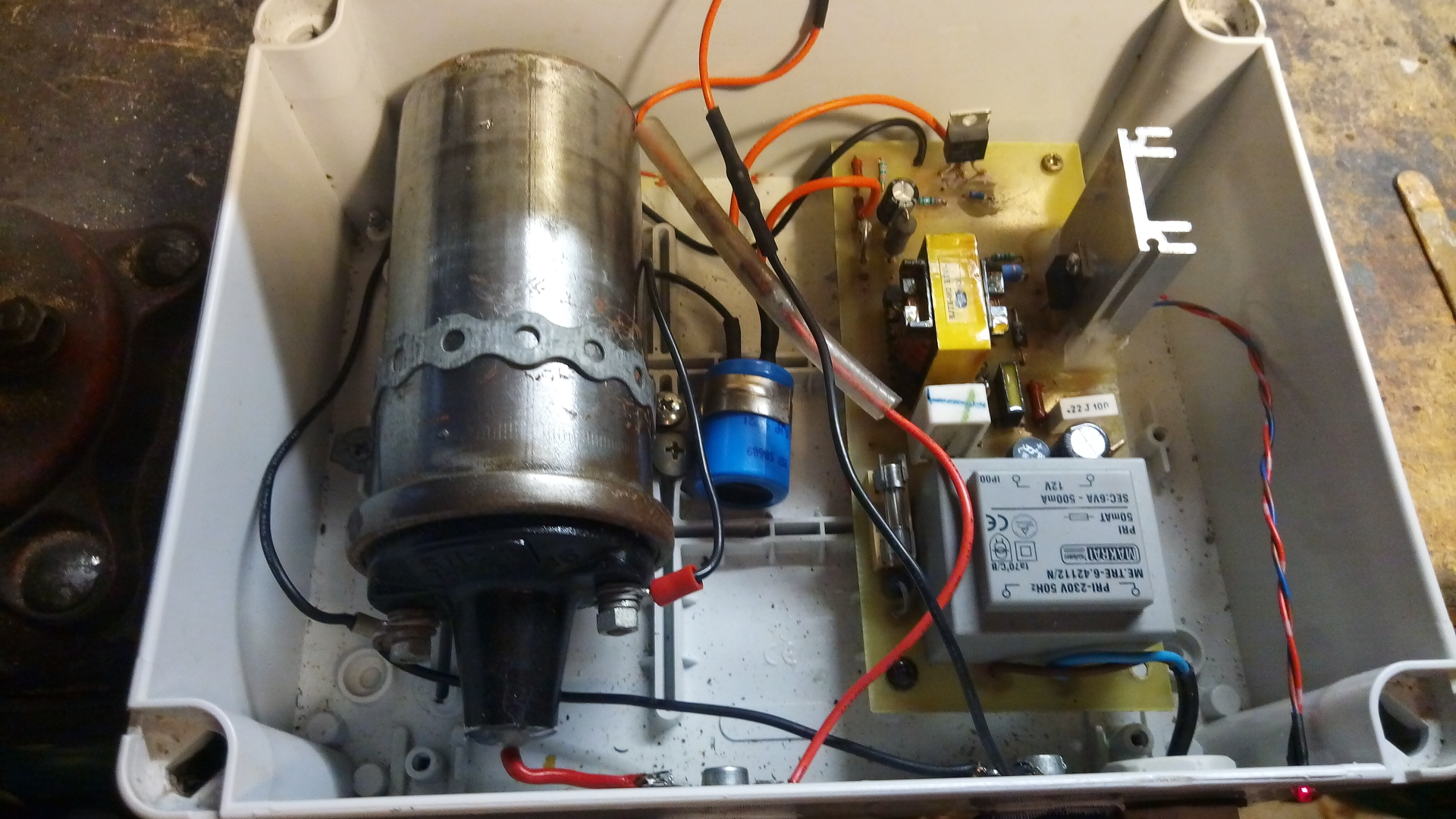 Az enyém így néz ki. Ebbe kivételesen beültettem a potit, de ellenállást teszek helyére (osztót) Ennyi az egész villanypásztor. Nem szoktam hatalmas dobozba tenni sosem. A nyákot vagy viaszba öntöm mindenestől, vagy bő lakkba áztatom, mert a dobozon belűli hőmérséklet különbség több bajt okoz, mint más. A párától szét oxidálódik minden idővel. Ajánlom megfontolásra ezt neked is. És mint látod, úgy üzemel, hogy hűteni se kell semmit sem. 5km drótot erre ráköthetsz, légmagos nagyfesz tekercset is magam tekerem és gyantával kiöntöm, mert a kocsi gyujtótrafók csak látványelemek, ha hosszú drótot kötnek rá, elvész az ereje, szinte semmig se csinál úgy leterhelődik. Hosszú kerítéshez áram kell a nagyfesznél, hogy ne foggyon el a kraft. A fazékmagon nekem úgy emlékszem 40/ 400, vagy 40/ 300 menet van, már nem tudom. 500-600V - ot sütök ki a tirisztorral. A gicsi graetz az SF18 dióda!!! Vagy ilyen gyors nagyfrekis más 1000V-os lehet.