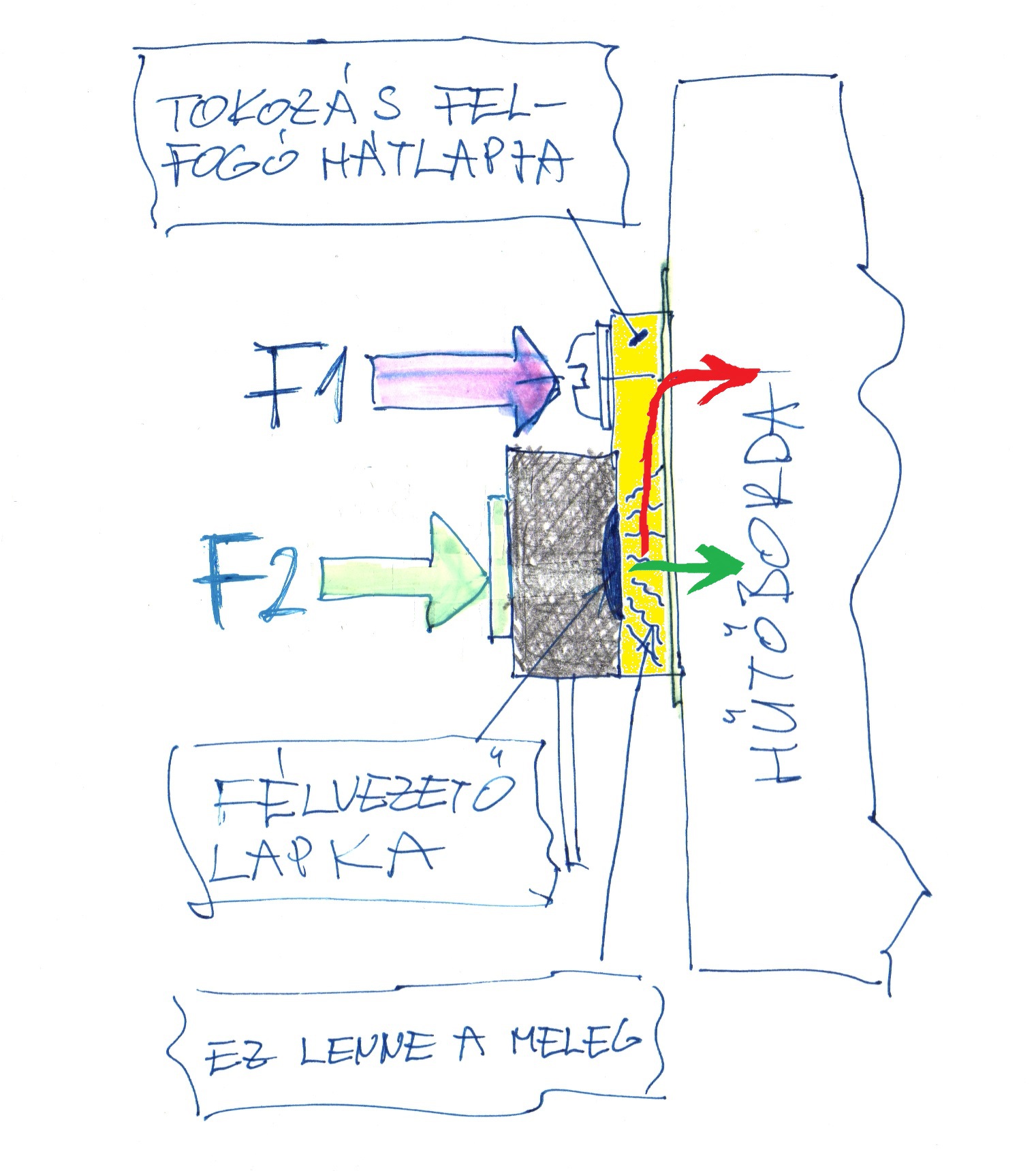 Rajzoltam egy ábrát arról, miben látom a különbséget a saját csavaros, és a leszorítós felfogások között. Ha az F1 erő szorítja a tokozást a bordához, akkor a hőnek kb. a piros nyíllal jelölt úton áramlik a nagyrésze. Ezzel szemben ha az F2 erőt alkalmazzuk, akkor a zöld nyíllal jelzett (rövidebb) úton távozhat a hő nagyrésze. Kritikus esetben számíthat ez a különbség.