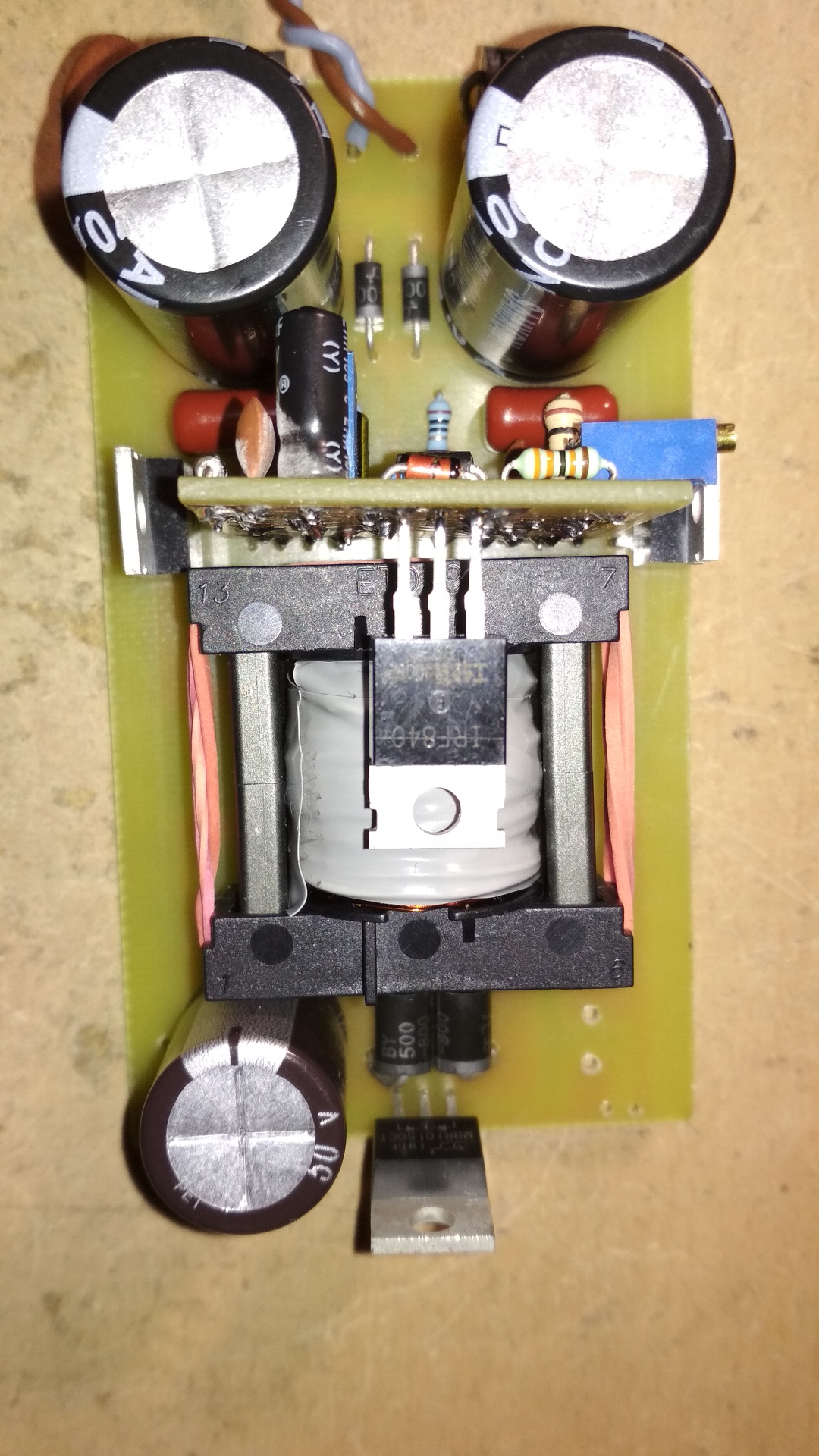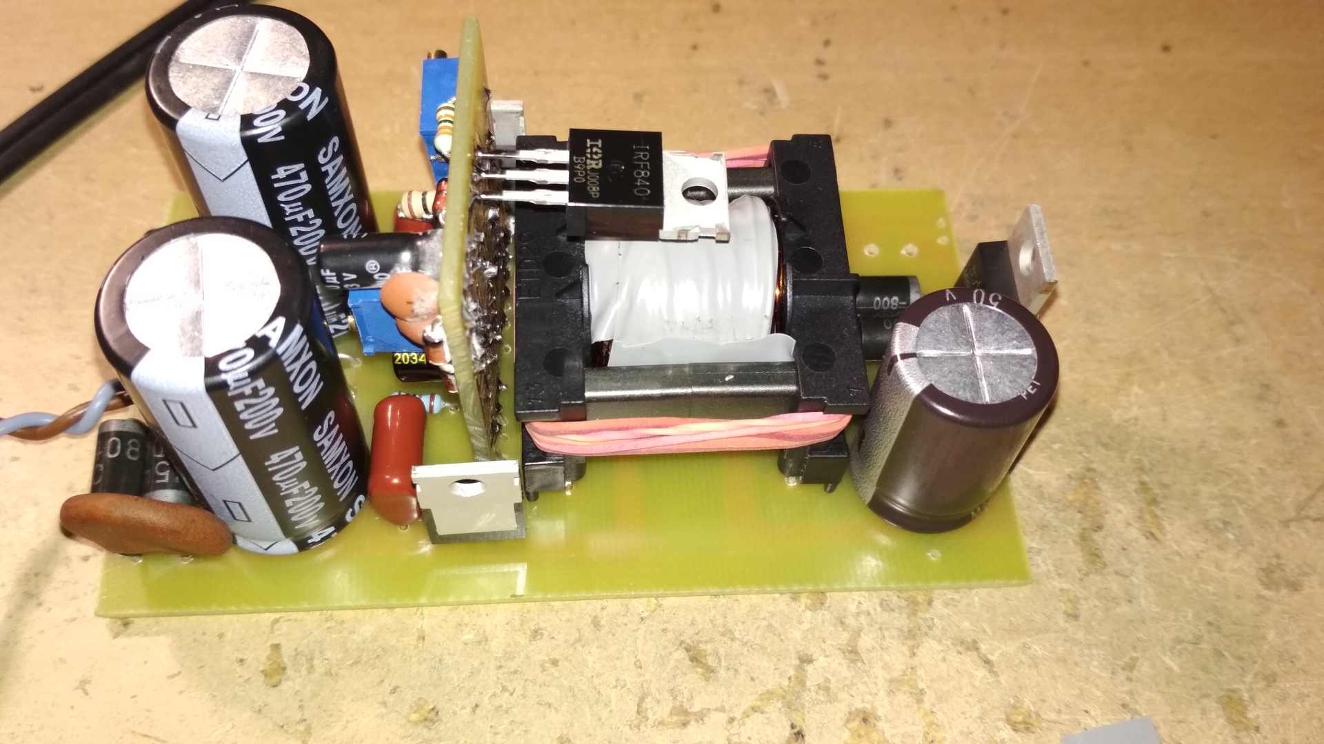 Szia, Így elnézve a trafóját a primer és szekunder menetek majdnem összeérnek, sok szigetelés nincs, az biztos. Ez így életveszélyes. A javítgatás helyett keress valami korrektebb tápot.