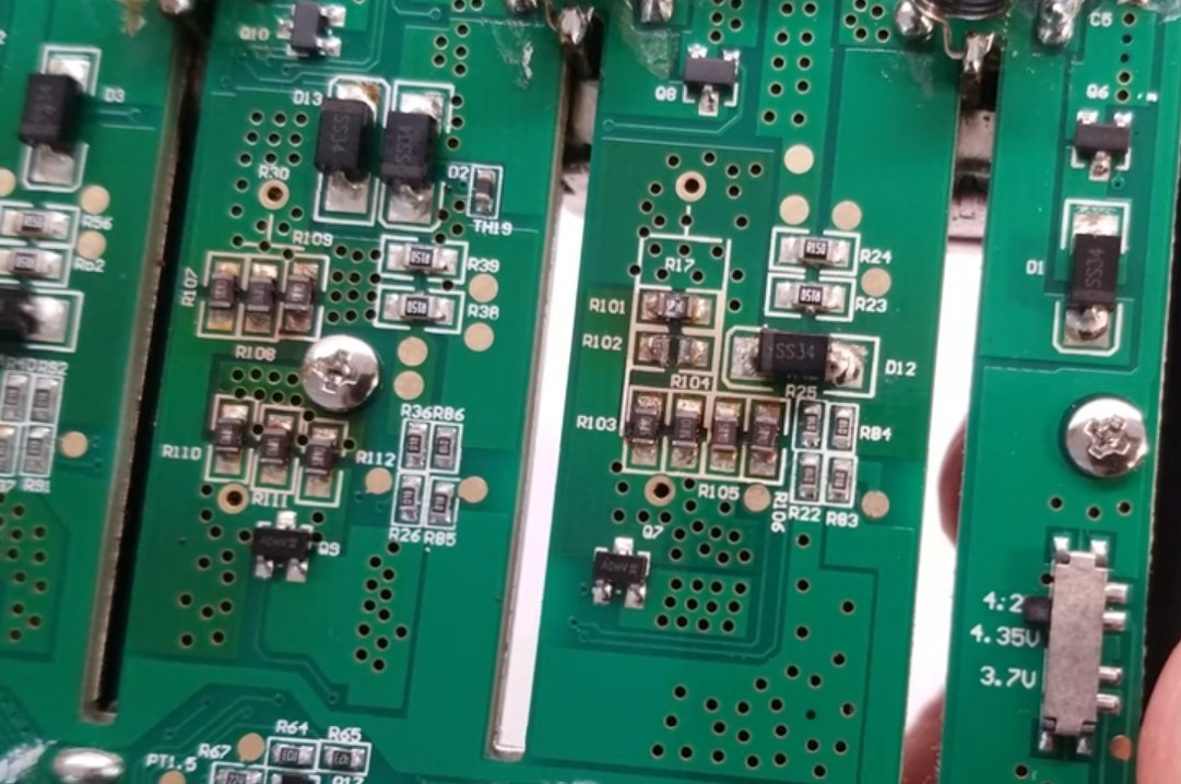 4-5db 5R1 SMD ellenállás van a nyákon cellánként (párhuzamosan), ez kb. 1Ohm lenne, viszont 4.2V-nál az 1Ohm 4A-t folyatna, plusz a pici SMD ellenállások nem fognak tudni 4W-ot elfűteni.