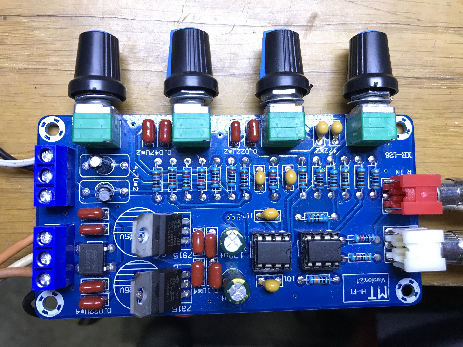 Tda7294 kit ele ne5532-es a kepen lathato eloerositos eq-t kotottem probakeppen. Most meg csak a jobb es a bal csatornat probaltam ki rajta,szolt,mukodott szepen mindketto. Tapfesz 26-0-26 V AC. Pozitiv es negativ oldalon is van egy egy 15V -os stabilizator. Problemam,hogy az egyik csatorna offos lett,se zaj,se bugas csak nema csend. A stab ic-ken es mindket NE5532 labain megvannak a tapfeszek. Megcsereltem a foglalatban oket, es a hiba nem ment at a masik csatornara ebbol gondolom,hogy azok jok. A ket pufferkondik nagyobb feszultsegure csereltem. Mit kene vizsgalnom?