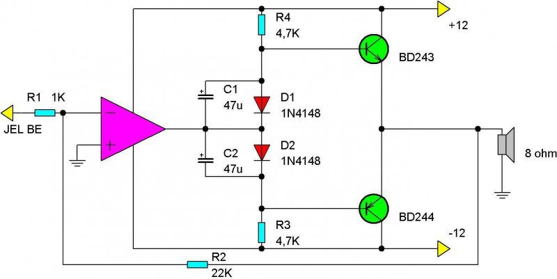 Szia! A bázis-kollektor ellenállással a nyugalmi áramot tudod beállítani. Az erősítő 5-6 W-ot ad le 8 Ω-ra.