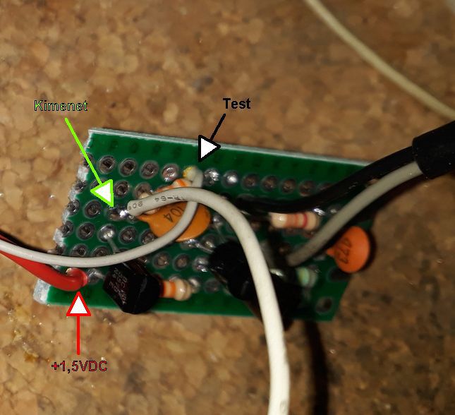 Ha van kedved, tehetsz még egy kísérletet. Szinte azonos alkatrészekből áll, kivét néhány ellenállás értéket. Nem kell külön tápfesz, elég az 1.5V. Remélhetőleg most már eligazodsz a bekötéseken és az összetákolt panelképen.