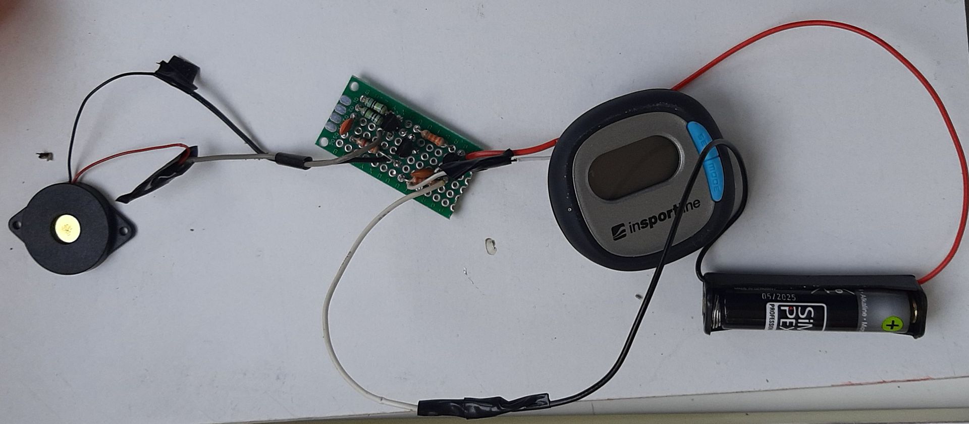 Ez egy jobb kép, itt látszik a lépésszámlálóba forrasztott kábel. A lépésszámláló alját megfúrtam és azon átfűztem a drótot a forrasztás előtt.