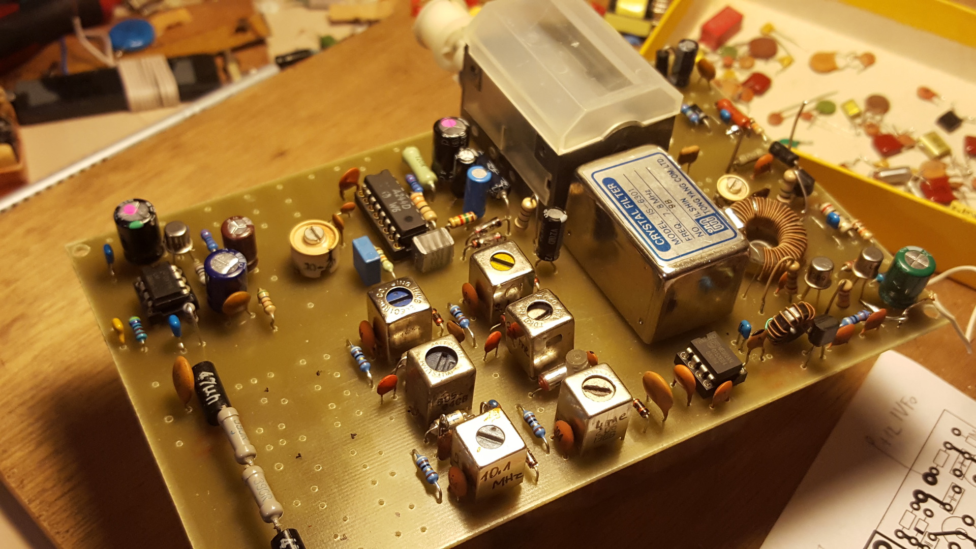 Ritkán szólaltam meg az utóbbi időkben itt a fórumban, de ismét van közlendőm főleg kezdő rádiózás iránt érdeklődők számára. Érdeklődés volt QRP rig építésre így ujjgyakorlatként építettem egy kis Rövidhullámú SSB vevőt melynek holnap lesz a "főpróbája". Előkerült egy régi CB rádióból kimentett 7,8 MHz-s ( jó széles) kristályszűrő és úgy gondoltam ez megteszi a vevőbe. Manapság divatjamúlt de érdekességként analóg forgókondenzátoros VFO-t építettem bele mégpedig két sávosat. 4MHz- 4,3 MHz-ig a 3,5 MHz-s sávot fogja át, 2,3 MHz-s résszel pedig a 10,1 MHz-s amatőr sávot. Ha megszólal akkor felteszek a youtube-re egy rövid videót róla.