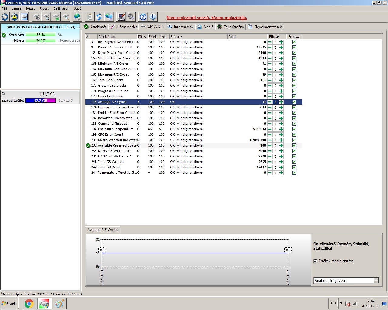 Becsült hátralévő élettartam : 14 nap Összes írt adatmennyiség : 76,72 GB