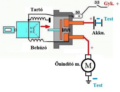 Szia! Az ábrán jól látható, hogy melyek a fő áramkörhöz tartozó vezeték részek amik az önindító motort működtetik. Most kizárásos alapon (mivel az önindító új) a behúzó tekercs fő érintkezője az hibátlan, tehát csak a piros és kék színnel jelölt vezetékek csatlakozási pontjai jöhetnek szóba és maga a fémtestek csatlakozása. Az akku az lehet hibátlan de a rácsatlakozó kábelének a sarujában a préselt kötés az lehet oxidos. Csíptess indító kábelt (de megfelelő keresztmetszetűt) a behúzó tekercs felső nagy csavarjára és az akku pozitívra és úgy próbálj indítani kulccsal.