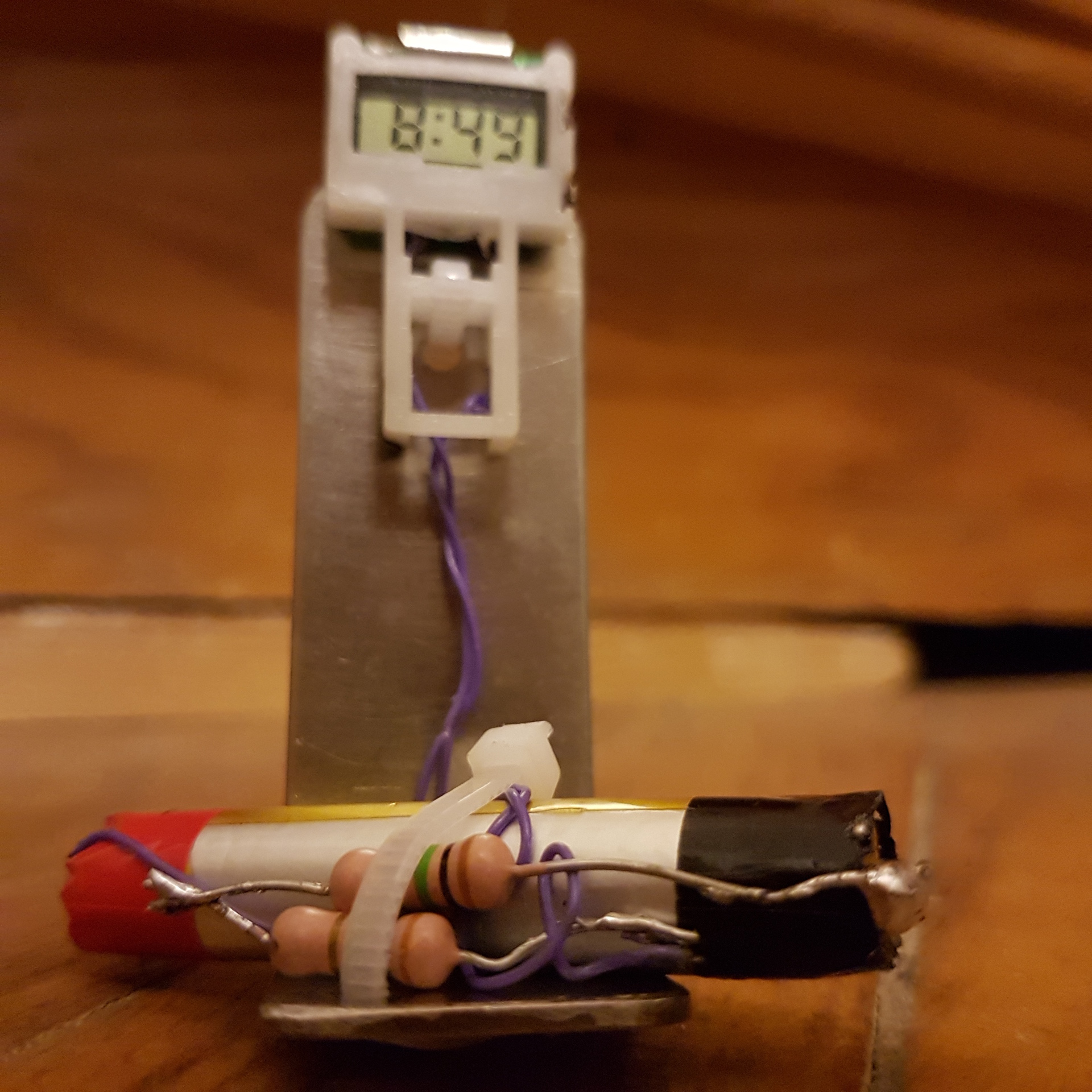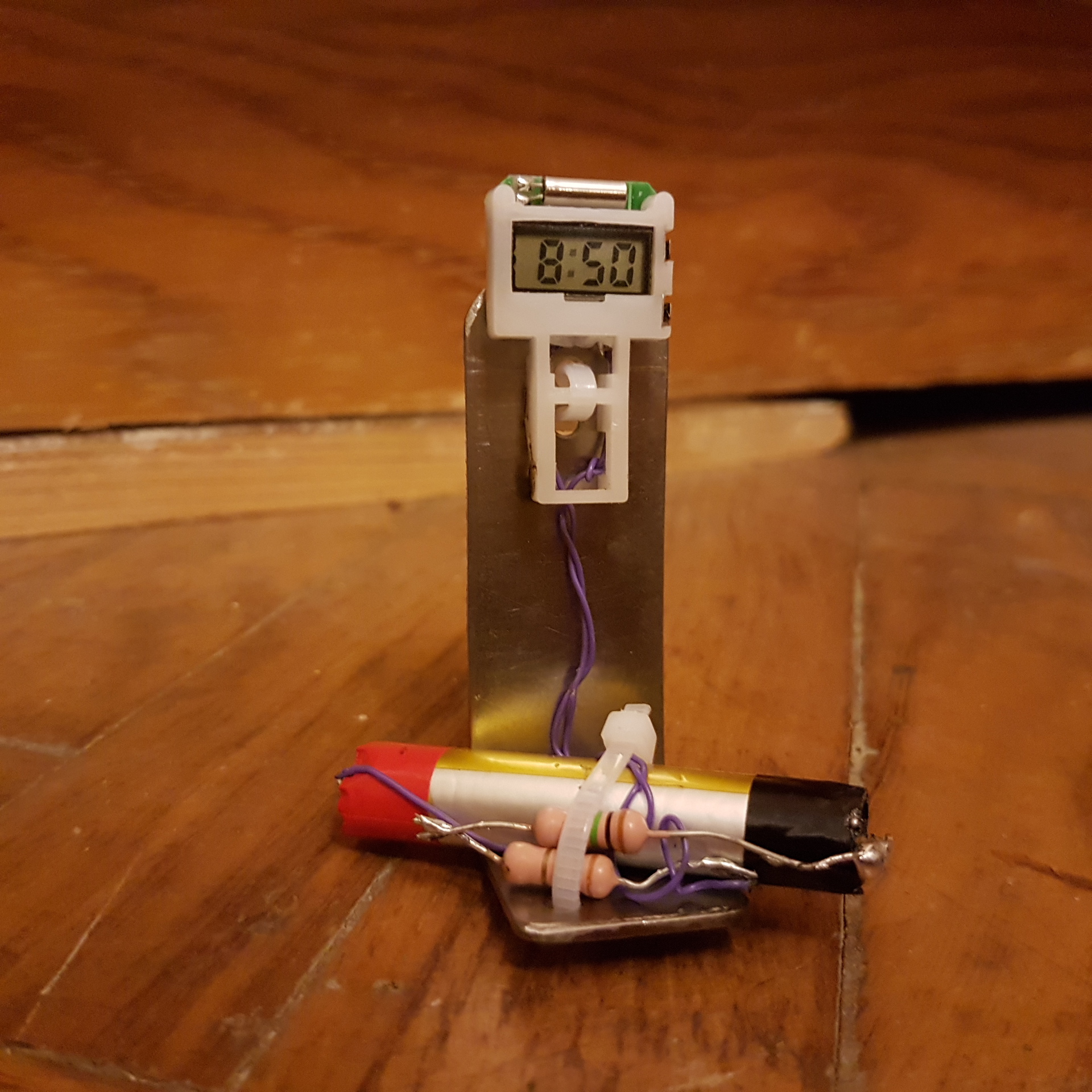 Újrahasznosított "McDonalds HappyMeal" karóra elektronika és e-cigarettából származó ~4.1V akkumulátor, valamint 2× 1MΩ ellenállás sorosan a negatív póluson. A váz egy egyszerű meghajlított fém elem, ami valahonnan visszamaradt.