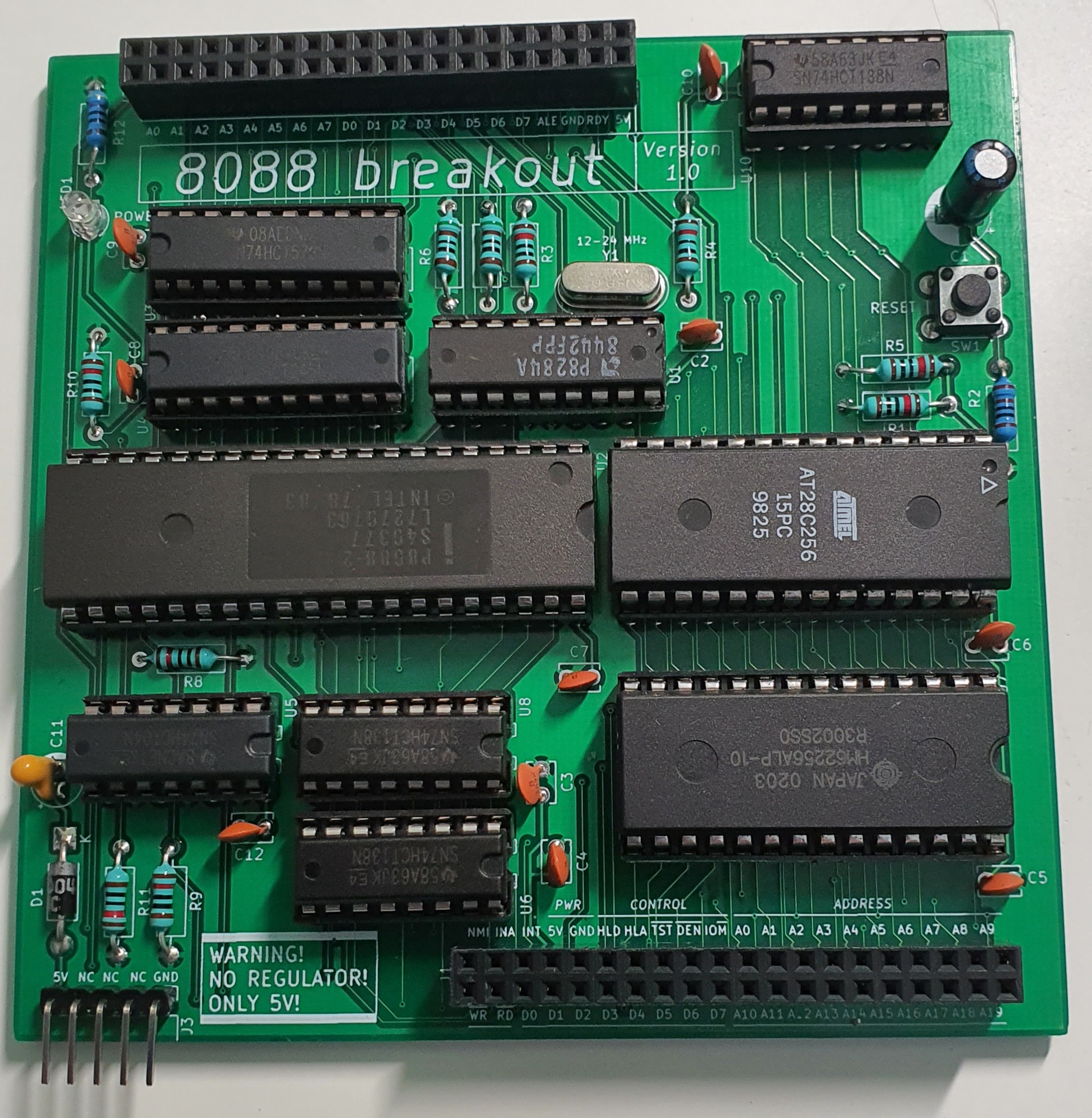 Gyakorlati haszna természetesen nincsen, de jól szórakoztatott amíg megterveztem és összeraktam. 32kb ROM és 32kb RAM van az alappanelen, egy CPU, egy órajelgenerator plusz pár logikai IC és a kivezetések szóval semmi extra.A programozása még várat magára egy-két napot amíg lesz időm játszani vele.
