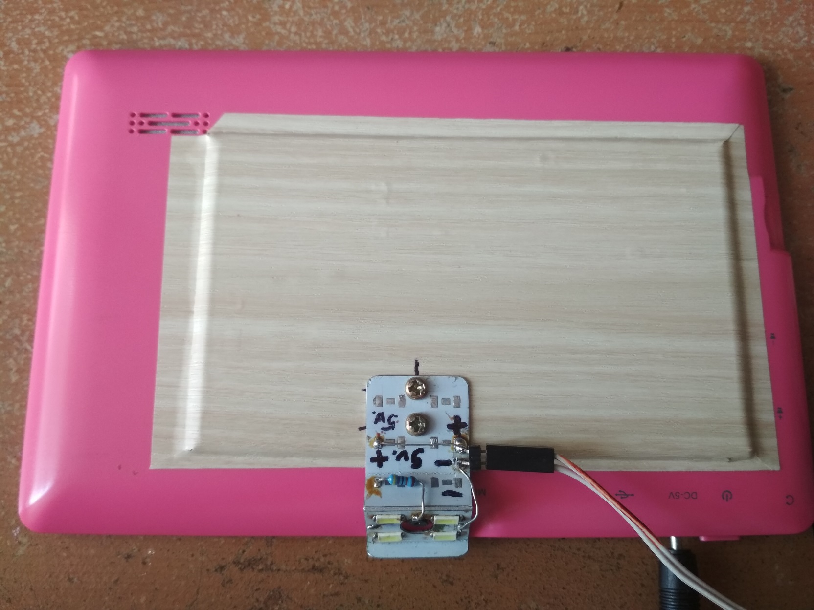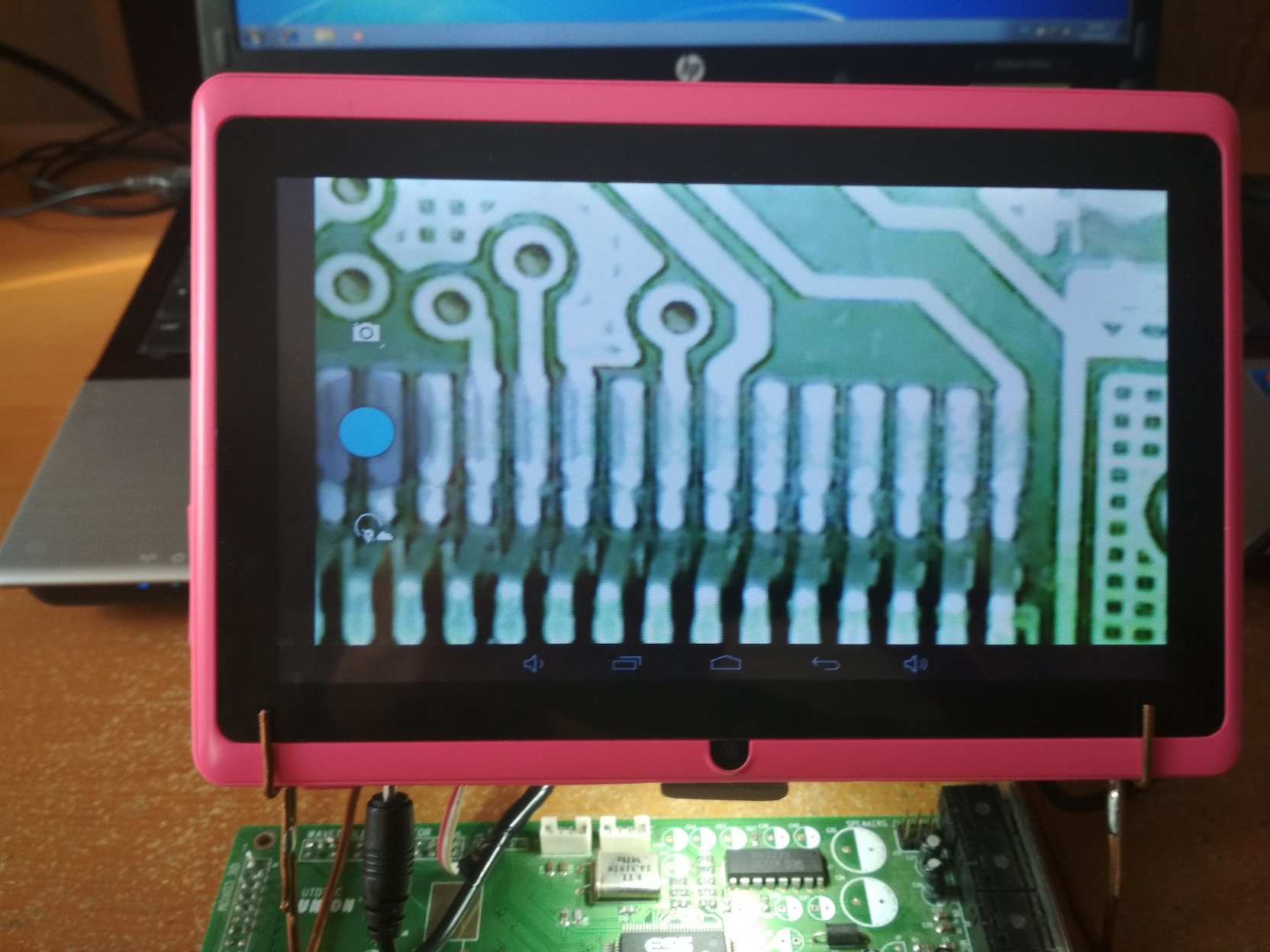 Kidobásra szánt tabletből alkottam egy szerelést segítő "nagyítót". Álványzata még nincs csak próba de jónak igérkezik. A tapéta alatt alu lemez a hűtést segíti gumi hőátadóval (valamiért tulmelegedett és lefagyott). A lényeg ha sikerül a fókuszt állítani utána már érdemes lehet az átalakításra. A kamera panel megfelelő szögben kifordítva és rögzítve, led világítással kiegészítve működhet.