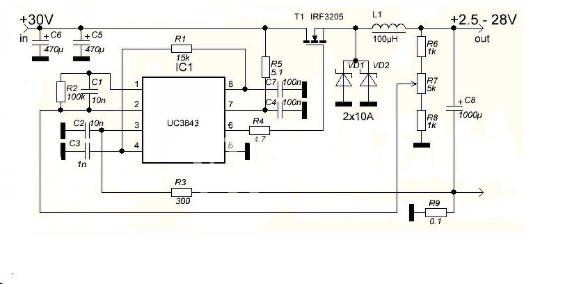 Ez a kapcsolás nem tudja a fetet teljesen kinyitni, mert földelt drainű kapcsolásban a teljes nyitáshoz legalább az UGS feszültséggel nagyobb tápfeszről kellene járnia a 3843-bak. De az sem szereti a túl magas tápot. Én a negatív oldalt szaggatnám földelt source kapcsolásban a fettel, a 3843 pedig stabil tizen valahány voltot kapna.