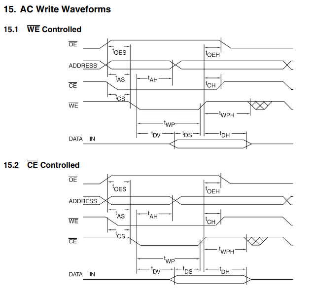 Az output enable mindig olyan érték, ami volt előtte, és olyan is marad. Tehát, ha olvasás volt akkor output módban van. Ilyenkor az oe-0-át vesz fel, ha nem az volt előtte. A write enable ilyenkor magas szinten van mindvégig. Megmértem.