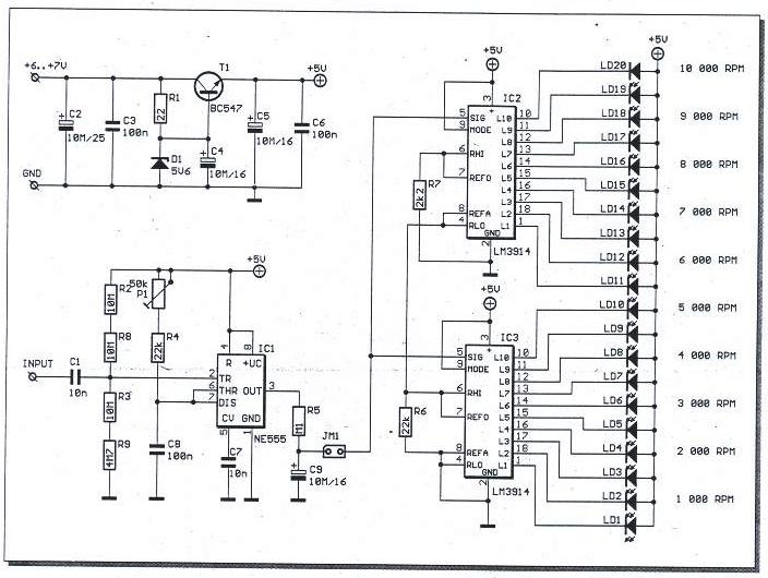 4 ütemű esetén 2szer több tehát a 2 ütemű mérő művedben lomhábbnak kell lennie az monostabilnak. Ez csak "kalibrálás" kérdése. Van ottan 1 poti annak az értéke legyen ( P1 )220 kiloohmos. R4 értéke meg 5 kOhm. Ismert frekvenciájú négyszögjel generátotrral meghajtod a bementet. Aztán addig csavarod a potit amig az a led világit ami a bejövő jel fordulatszámának felel meg. Ennyi az egész. tehát a freki kiszámítása amit be kell küldeni pl.: 1000 RPMhez 4 ütemre . tehát 1 fordulat alatt 4 impulzus jön létre. 1000 RPM az ezer fordulat / perc 1 másodperc alatt 1000/60 fordulat tehát 16.66 fordulat/másodperc .(Hz) Ekkor 4szer több impulzus 16.66*4 => 66.66 Hz Tehát ekkora frekit kell bekergetni 1 generátorból a bemenetre. pl 6000es fordulat nál tán jobb viszony jön ki. számoljál utána... Pl.: 6000 RPMnél éppen 400Hz lesz a bemenő freki értéke. Érdemes trimmerpotiból heli trimmert rakni inkább mint az ami a nyákon van esetleg ha meg van a "pontos" beállított mérő mű akkor érdemes fix értékű ellenállással kicserélni a potit akkor el se rázódhat lásd autó mód eléggé rázós üzem .No igen poti értékét meg kell mérni az áramkörből való kiforrasztás után . Ekkor már csak az összes alkatrész hőfok függésse befolyásolja mérés pontosságát.Igaz ilyen durva lépésű műszernél ez kevésbé fontos... tájékoztató értékek. R5 C9 isbefolyásolja a kijelzést.