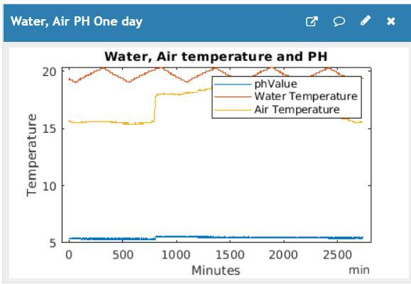 Emellett EC és PH kalibráció még nem megoldott, mivel a gyári kód eppromban tárolná, viszont az a programrész nálam valamiért nem működik (értékre "Infinity" érkezik), szerencsére kalibráció nélkül is tizeden belül van a pontossága,szóval egyelőre anélkül is használható. Ezen felül a Matlab vizualizációs eszközöket is próbálom kiismerni, kisebb-nagyobb sikerrel. A ThingSpeak javaslatért hatalmas köszönet jár, nagyon tetszik a platform, valószínűleg évekig tartogat kísérleteznivalót.