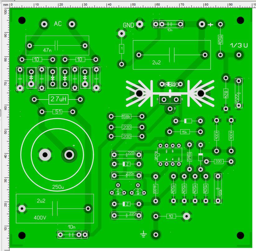 Van régről egy méretre indokolatlanul nagy áramköröm, ami viszont hűen követi az eredeti villamos felépítést. Mint jeleztem, ca. 15mA terhelésre semmiféle feszültségváltozást nem produkált - a századvoltig tudom mérni.