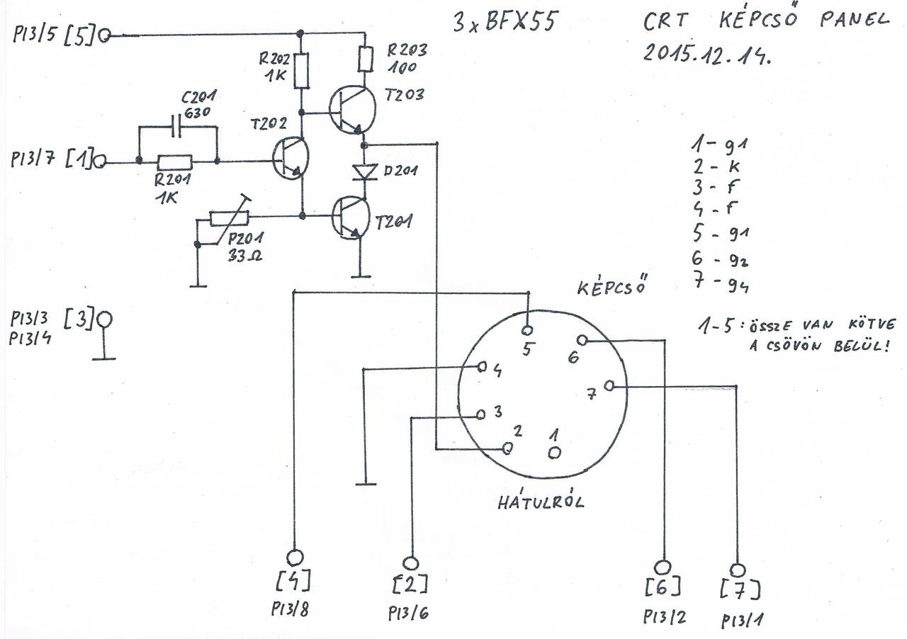 Fojtattam a CRT monitorral a munkát. Letisztáztam a visszafejtett kapcsolási rajzot, feltöltöm. Arra már rájöttem, hogy a monitor 11V-ról működik, mert közvetlenül rá van kötve a képcső fűtése a táp bemenetre. Ha jól értelmeztem a működését, akkor a 4011 által előállított négyszögjel által vezérelt T104 szaggassa meg a 11V DC-t, ezt transzformálja fel és állítja elő a megfelelő feszültséget. Vajon a PI1/7 bemenet mire szolgál? A képcső panelen ha jól gondolom akkor a videó erősítő van, akkor pedig a PI3/7 a video bemenet? Jól gondolom? Feltöltöm a képcső adatlapját, köszönet érte Tóth Istvánnak.