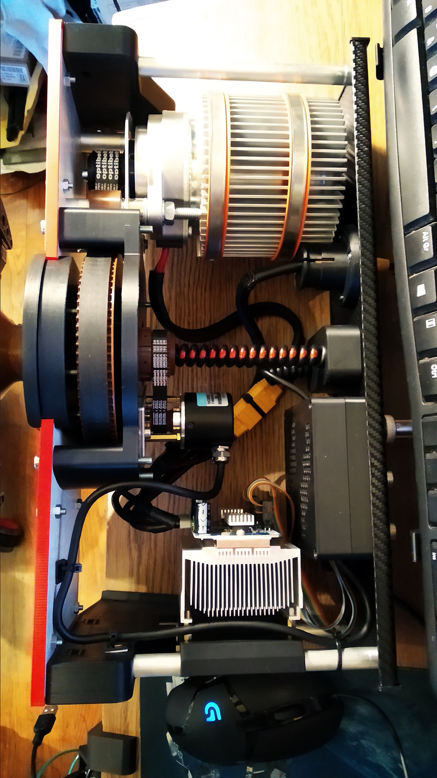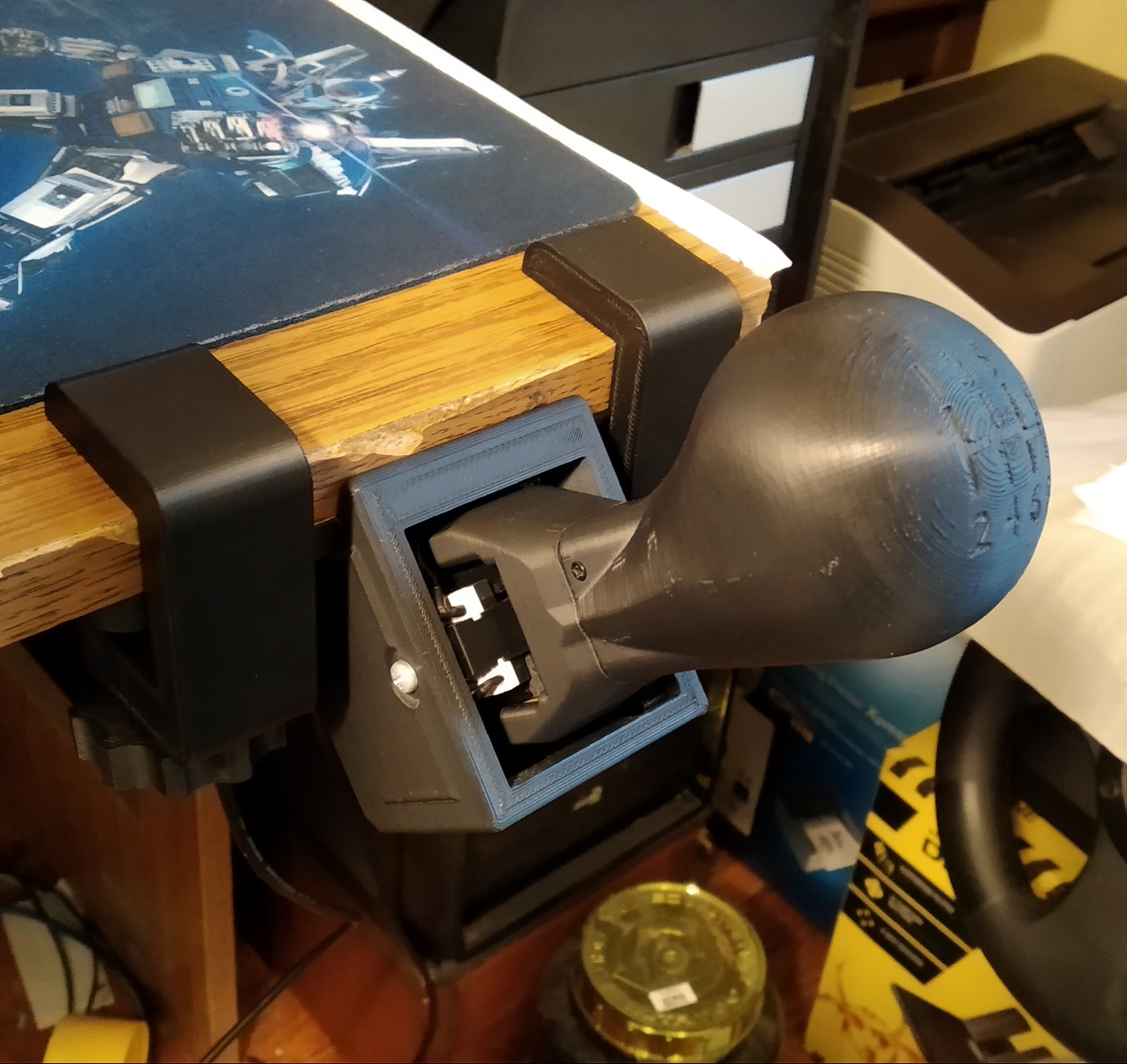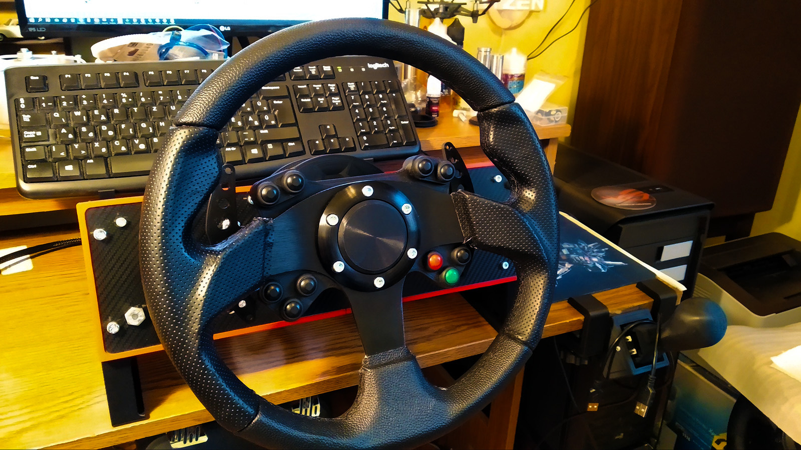 Force feedback kormány, és pedál szett. Az alapja egy Arduino Leonardo, amin a EMC development lite verziója fut.Bővebben: Link Az egészet Fusion 360-ba terveztem, és túlnyomórészt 3D nyomtatott cuccokból áll. A motor egy Opel Corsa kormányszervo motorja, aminek a teljesítménye több mint elegendő. Maximum 30-40%-ra tudom állítani a játékokban az ffb-t, mert afelett használhatatlanul erős. A hűtését 15x2mm alumínium laposrudakból oldottam meg, ennél jobbat nem tudtam kitalálni. A tápegység egy 500 wattos LED driver. Próbálkoztam PC tápokkal, de kiderült, hogy a rájuk írt csillió ampereknek nem sok köze van a valósághoz. A kormány tengelye is nyomtatott, amit egy 20mm-es alu csővel erősítettem meg, ebben tekeredik a 8 eres spirálkábele a gomboknak. A pedál alapja fa. A karok mindegyikében 3 egyforma torziós rugó van, a fék kettő, a kuplung egy másodlagos rugót kapott, hogy valamennyire hasonlítson az igazira. A H-váltót Thingiversen találtam, azt csak kinyomtattam.