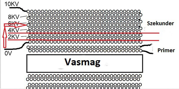 Ez egy 1:16 as áttételű villanypásztor trafó. A széleknél kiöntés után a műgyanta vákumozva kitolti. Így esélytelen hogy a menet valaha is megmozduljon. Példaként mutatok egy gyári villámcsapott villanypásztor trafót. Kiöntés után az általam tekert is ilyen metszeti képet adna. Plusz a szemléletesség kedvéért két "móricka" rajz. A piros csíkok a szigetelő fóliát jelölik. A nyilak pediga kuszóáram útját. A szélekig kitekert szekunder sorvégei "látnák egymást". Igy viszont még az esetleges impregnálási hibák ellenére sem talál utat a nagyfeszültség. A hozzászólás módosítva: Ápr 28, 2021