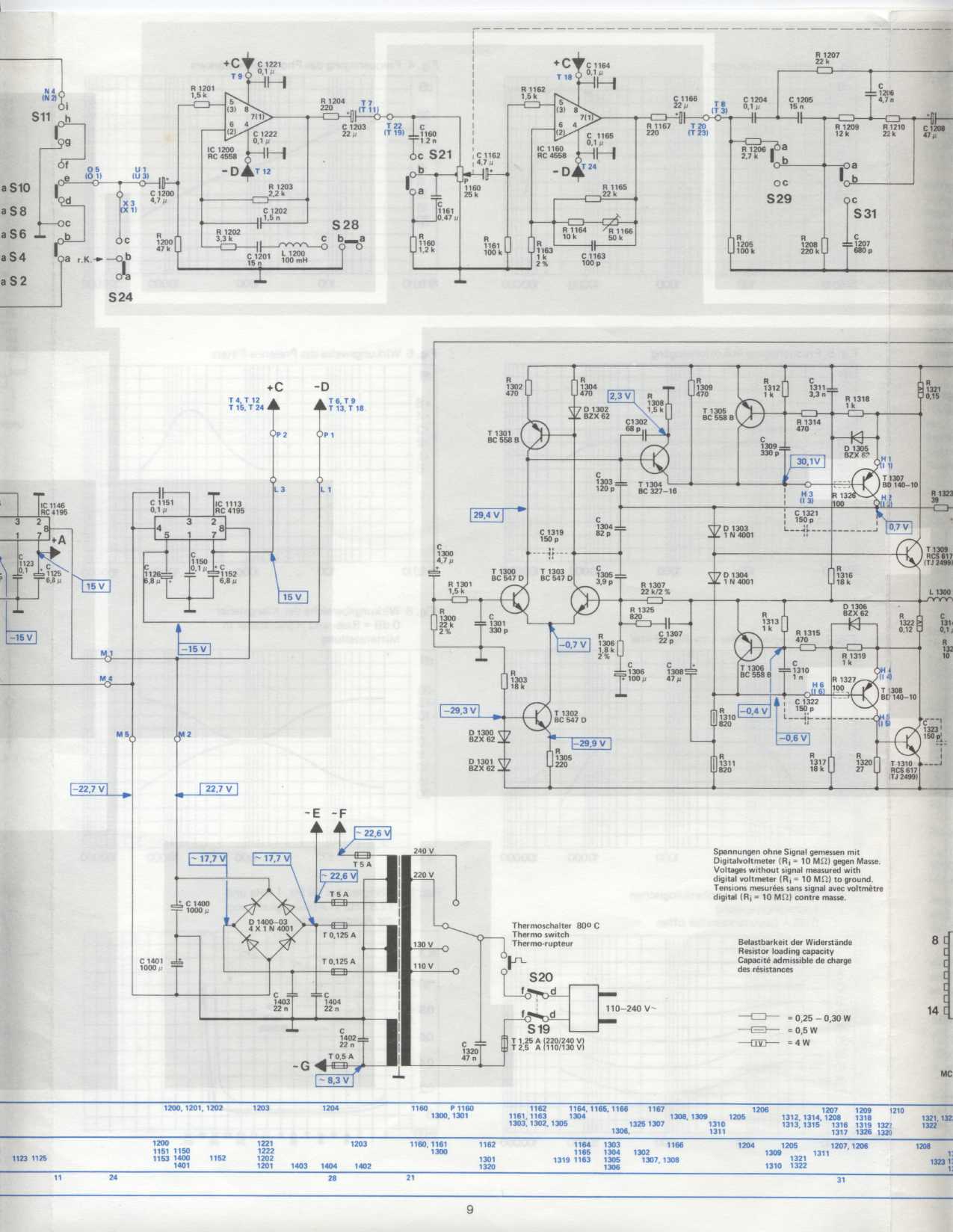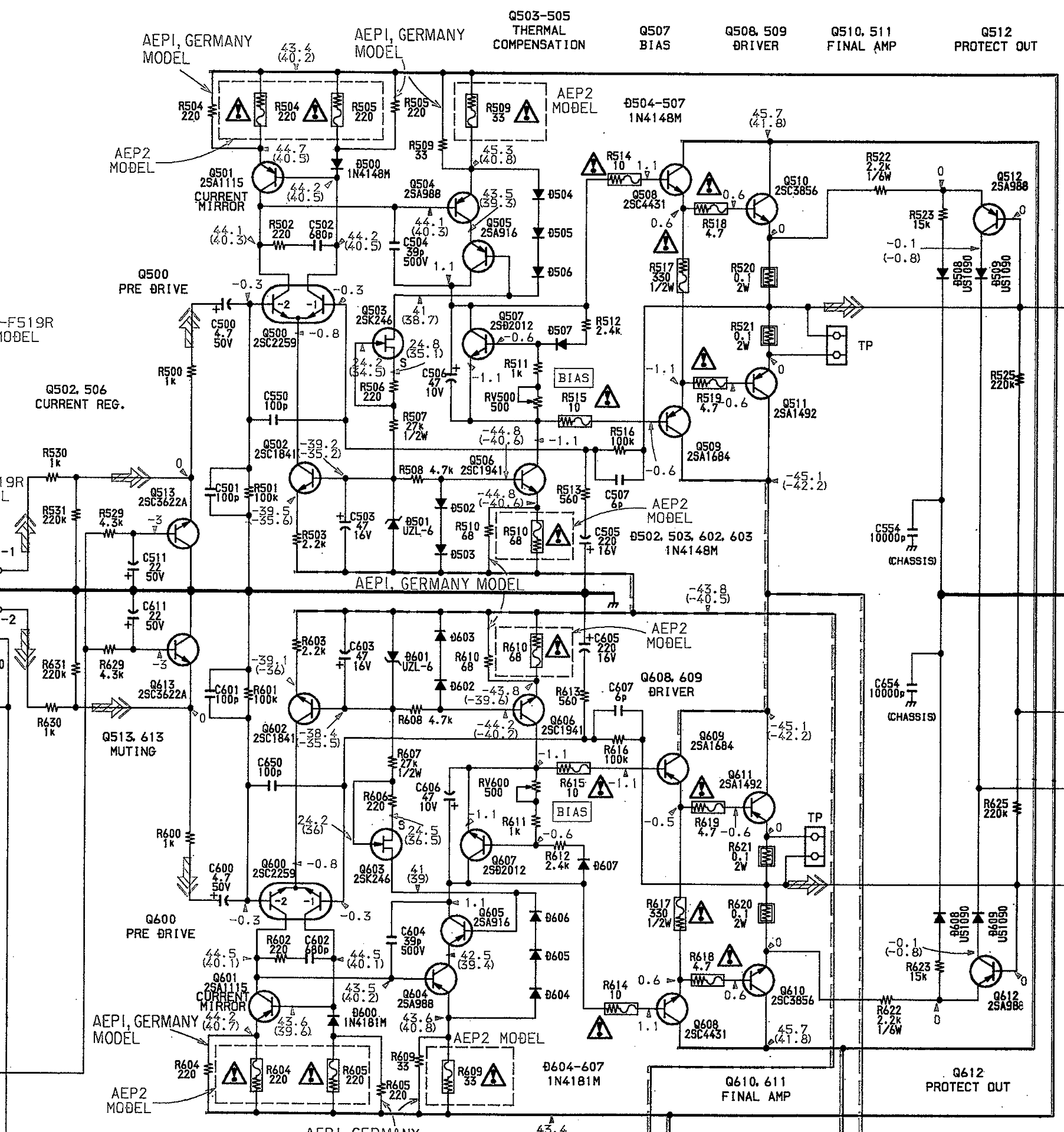 Lemértem nagyjából minden aktív elemet feszültségekre, csatolom a fotót a jegyzetekről. Ezek alapján nekem úgy tűnt, hogy a Q506-tól kezdve hibázik az egyik oldal, így próbaképp kivettem azt, de kiszedve semmi hibát nem mutat, még be is méri 178-as erősítésűnek a multiméterem. Az emitterénél levő 68 ohm ép (67,5). A többi tranzisztort az áramkörben hagyva ellenőriztem C-E zárlatra, de ilyen hibát sem találtam.