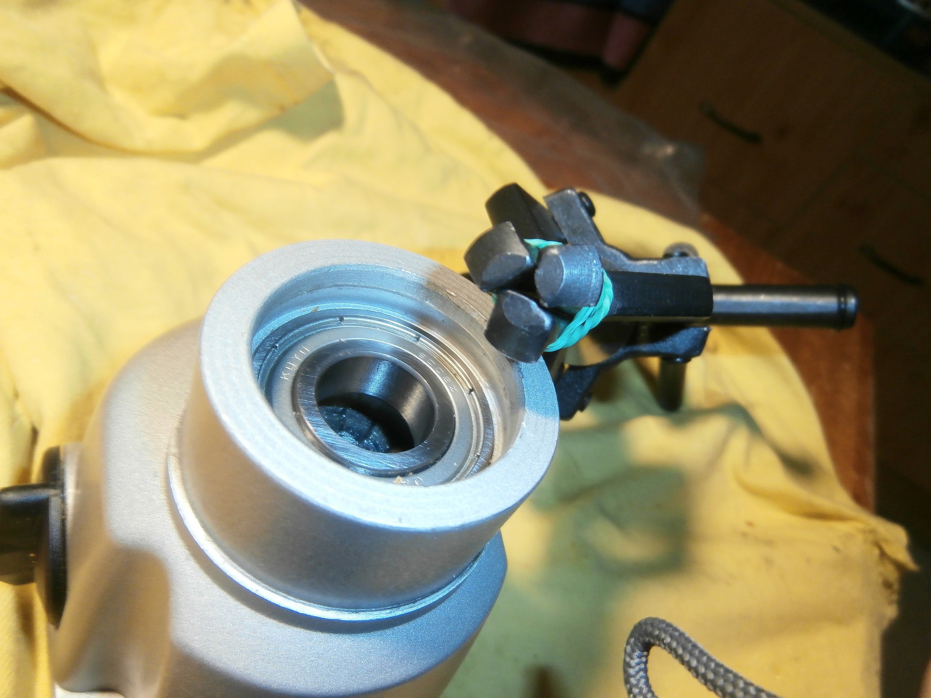 az ajánlatod nem megnyugtató. Nem volt a kezedbe e műremek, így nem tapasztalhattad meg a specialitásait. Az adott tűcsapágy a gép orrában tartja a fogaskeréktengelyt. De igen sajátosan. A tengelyvég belelóg a tűcsapágyba, és alátét nélkül a ferde fogak verik a tűcsapágy állórészét, így ha oda gyenge lemez kerülne, előbb lehet, hogy tölcsért csinálna belőle, de hogy utána mi lenne? A nagyobbik lyuk, a tokmánytengelyé. Attól nyolc óra irányban a tűcsapágy.