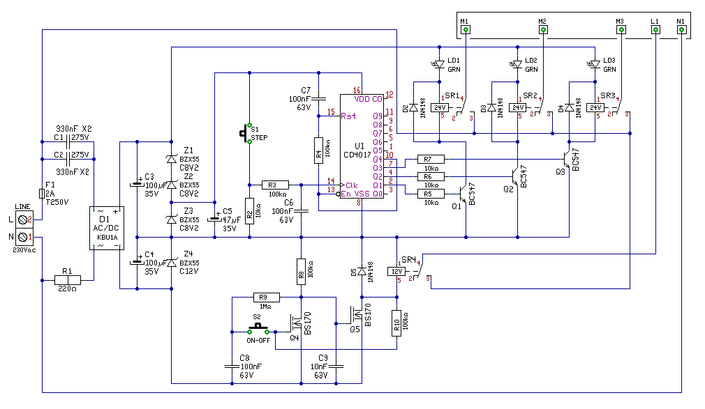 Közben meg lett a hiba. Volt 2db BS170-em, azokkal próbáltam. megnéztem a lábkiosztásukat is és a szerint is kötöttem be őket. De az első bekapcsolás után a D-S átment rövidzárba.Nem tudom miért. Most be tettem a helyére még egy BUZ11-et, mert a BS-ek holnap jönnek meg, és ezzel már rendesen működik.Mi lehetett a hiba? Igen, jól látod,ez egy pára elszívó vezérlés lenne, a betápot az eredetiről koppintottam,itt a rajz róla. A 3 relé a motor fokozatait kapcsolja,ez rendesen működik is,a másik áramkör pedig a lámpát kapcsolja ki-be. Most már ez is működik. Viszont együtt nem akarnak. Ha bekapcsolom a lámpát, akkor a másik három relét már nem bírja kapcsolni,mert a feszültség leesik 7-8v közé. Csak a visszajelző ledek világítanak. Ha ki kapcsolom a lámpát, akkor megint tudom a reléket léptetni.A lámpa reléje 12v-os 30mA, a fokozatkapcsolóké 24v-os.