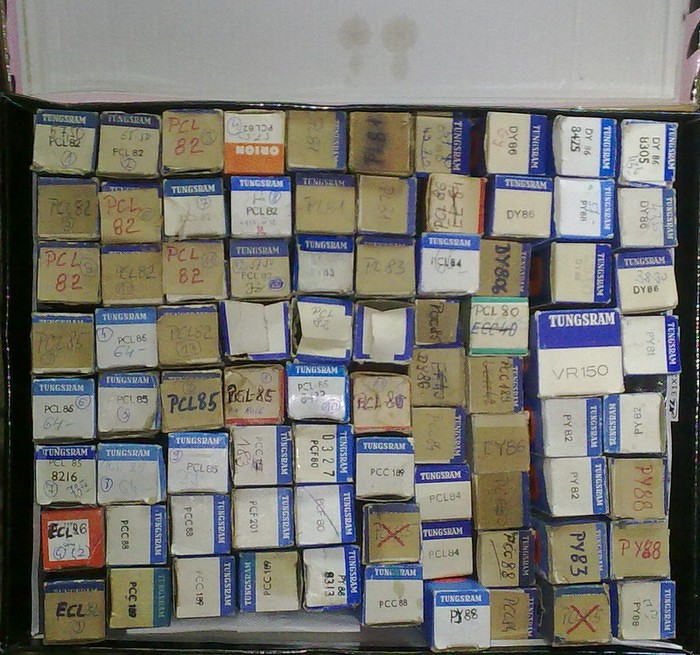Az lenne a csoda ha megtalálnád mindenféle felirat nélkül! Ha hiszed ha nem, ezeknek az apró csöveknek a legjobb elhelyezési módja a cipős doboz. Mindegyik doboz tetejére ráírom a cső típusát (ha még nem lenne ráírva) meg egy számot, ami alapján később bármikor be tudom azonosítani az excel táblában, ugyanis ami érdekel azokat mindet végigmérem, az adatokat beviszem egy táblázatba, amit bármikor meg tudok nézni, össze tudom egyiket a másikkal hasonlítani, tudok bármelyikhez grafikont rajzoltatni stb.