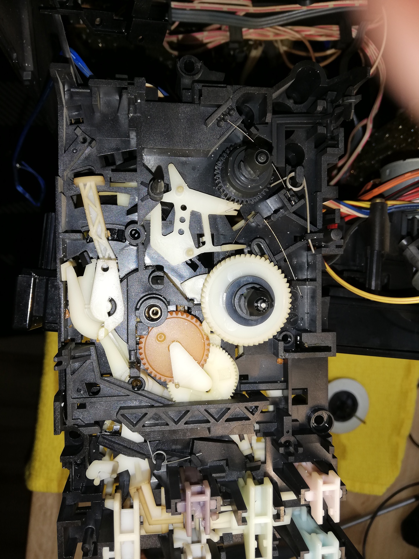 Üdv volt vkinek dolga Philips D8778 - al? Az van, hogy cserélem benne a szokásos problémás fogaskereket lejátszásához de kihullott belőle egy marék elporladt műgyantás cucc amik valaha az FF-RW-hez tartozó fogaskerekek voltak, de hol a helyük? S. manualon nem látszik semmi - képek is vannak lentebb.