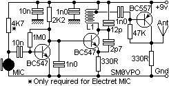 Az első tranyó simán egy alap hangfrekvenciás erősítő, a mikronon néhány tized mV feszültségű jelének erősítésére van. Az utána következő föld felé 1nF a nagyfrekvenciás összetevőket söntöli (nyomja el) az oszcillátortranyó bázisáró. Ez, a második tranyó DC ccsatolásban kapja az előző fokozatból az előfeszítést, és egy szintén igen alap kiépítésű nagyfrekvenciás oszcillátor kapcsolást alkot. A kollektorköri rezgőkörből kapacitív úton csatoljuk ki a jelet a harmadik, részbe (főleg) elválasztő, illesztő fokozatnak. Itt a 47k-s ellenállat ennek a tranyónak az egyenáramú munkapontját állítja be, néküle a tranyó nem nyitna ki, nem csinálna semmit. Ennek a tranyónak a kollektoráról immár a hasznos FM jelet vehetjük le, amit az antennához vezetsz.