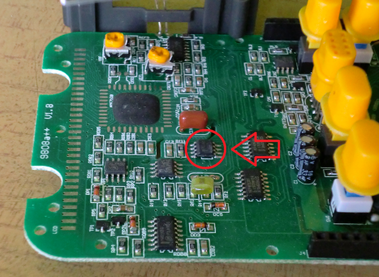 A kérdéses IC-nek U3 a jelölése a panelon, de a rajzon más jelölést használnak. Én az IC5: TL072-re tippelnék.