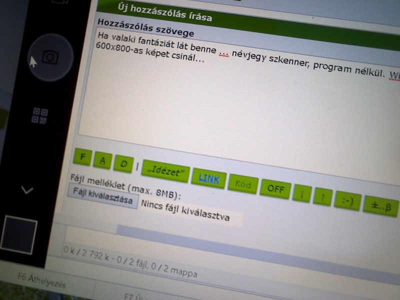 Ha valaki fantáziát lát benne ... névjegy szkenner, program nélkül. Win 10 kameraként felismeri, 600x800-as képet csinál (ennél jobbat, mert remeg a kezem), de csak kb. 20-30 centiig éles a kép.