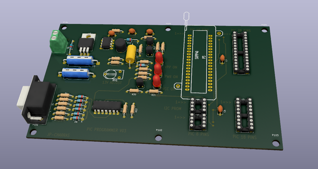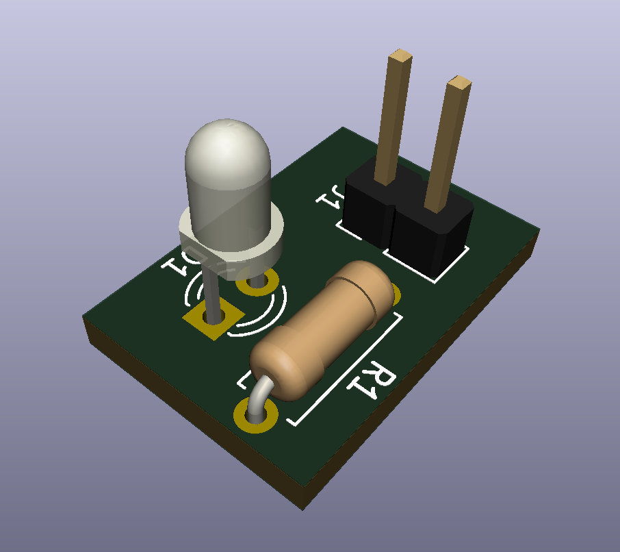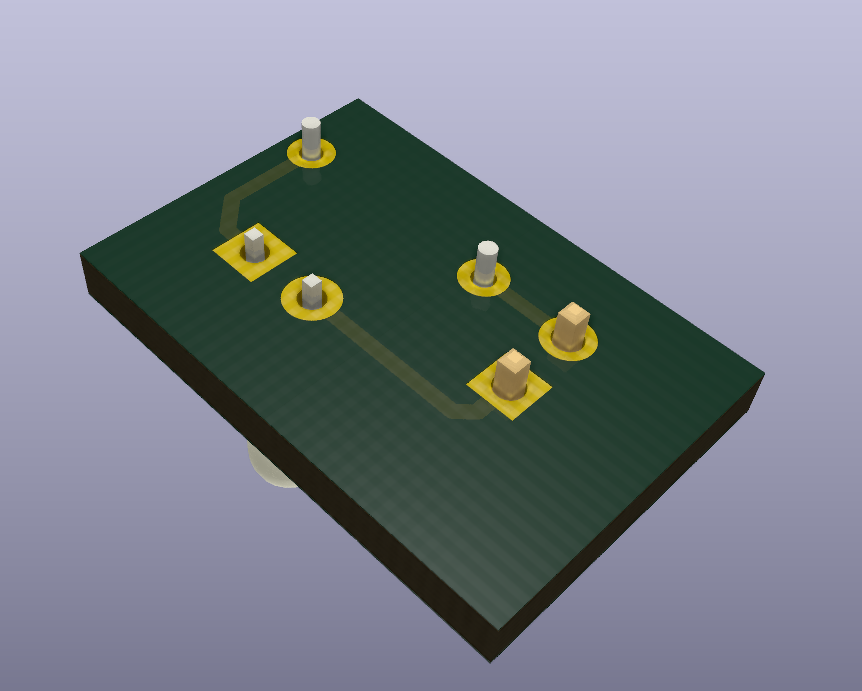 Amit elsőre összehoztam egyszerű áramkör 3d-be így néz ki. Lehet raytrace-elt nézetet is generálni, amin még az alkatrészek árnyéka is látszik.