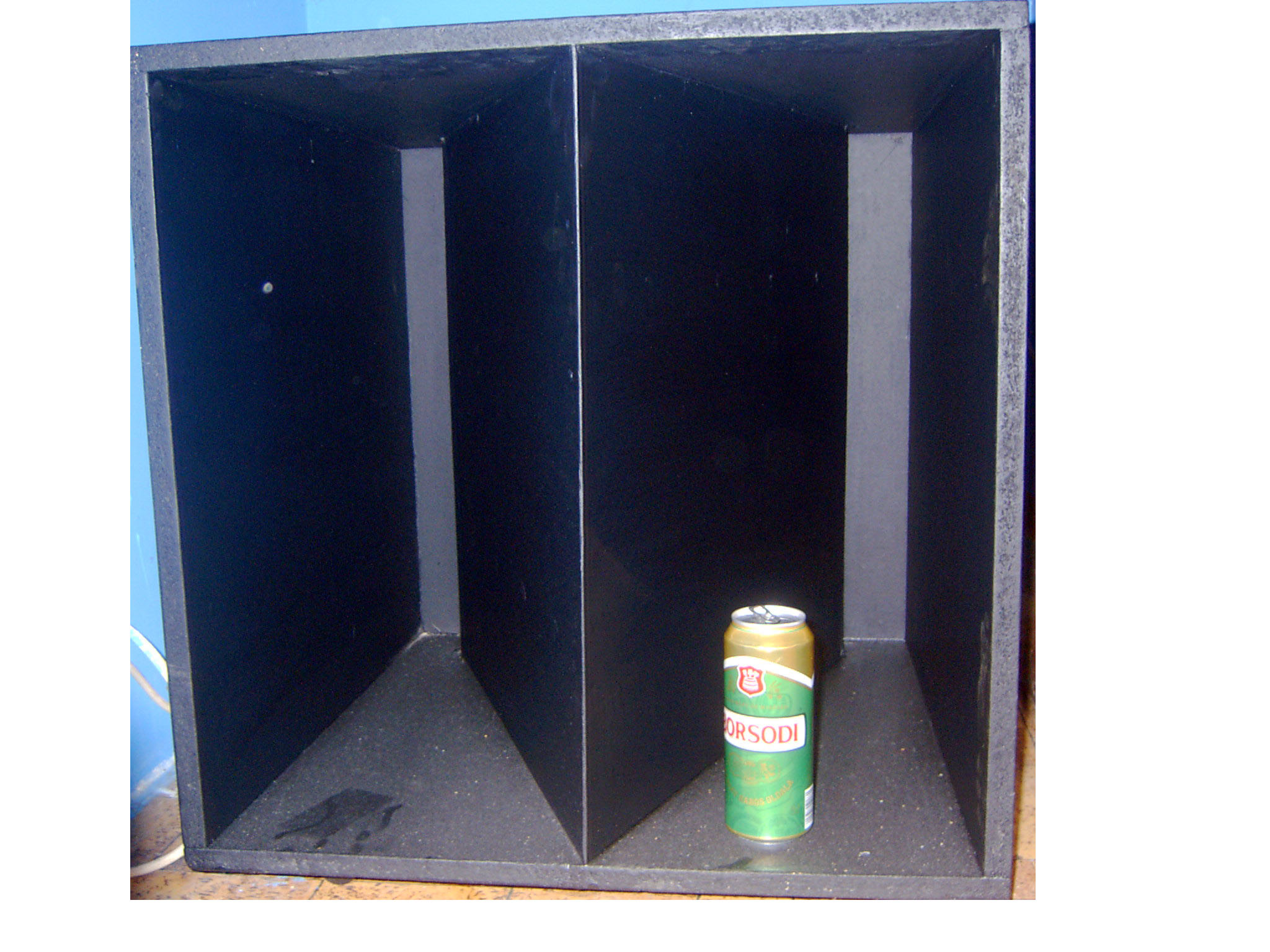 a végeredmény 19mm-es mdf lapból készült el, egyik sarka ferdén lecsapva, így kb. 16literecskére sikerült. az egészet kitömtem vatelinnel, hogy mégis valamivel tágasabbnak tűnjön a hanghullámoknak a belsőtér, és az egészet (nem vicc) padlószőnyeggel vontam be. persze minden illesztést fürdőszobai szilikonnal kikentem, amíg el nem fogyott a maradékot meg folyékony ragasztóval (ezzel a hőre olvadó pisztolyos cuccal) kentem ki. az egész doboz zárt, és nagyon szépen szól.