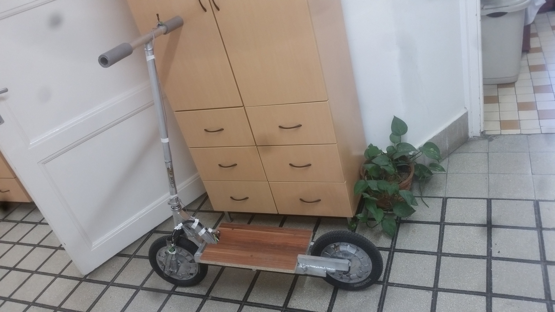 A korábbi, kis(tömör)kerekű roller eléggé rázott a rossz úton, átalakítottam 12 collos, tömlős kerekűre. A talapzatot - amin állni lehet - kiszélesítettem, egyéb paraméterek változatlanok.