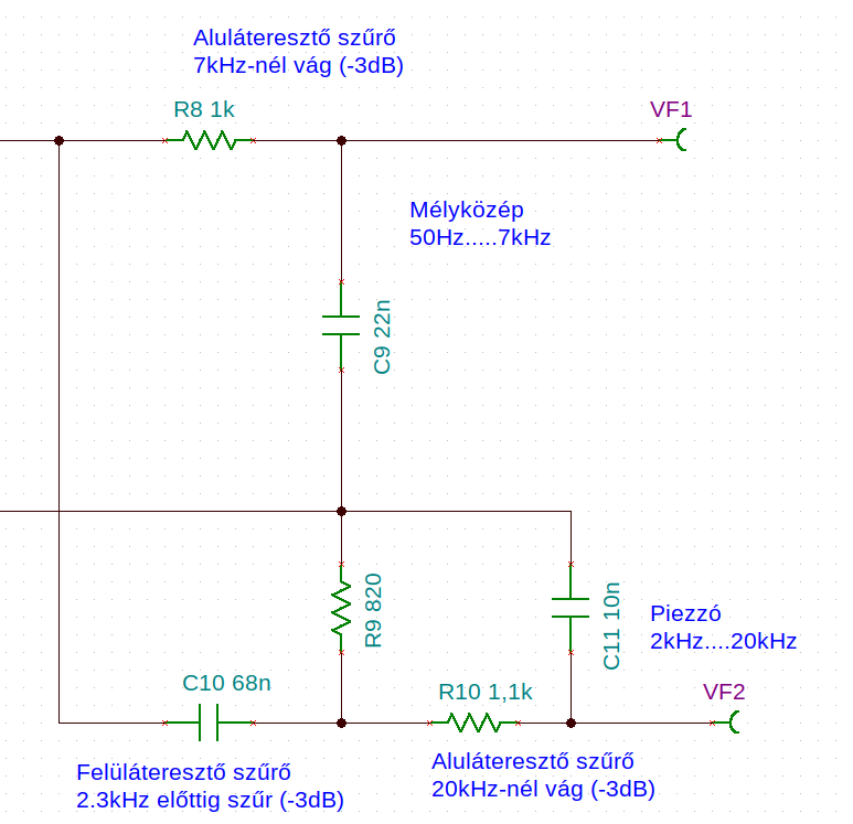 Csináltam egy aluláteresztőt a mélyközépnek ami 7kHz -nél vág, és külön elágaztattam még egy sávszűrőt is a piezonak ami 2.3kHz...20kHz-es tartományban átenged.