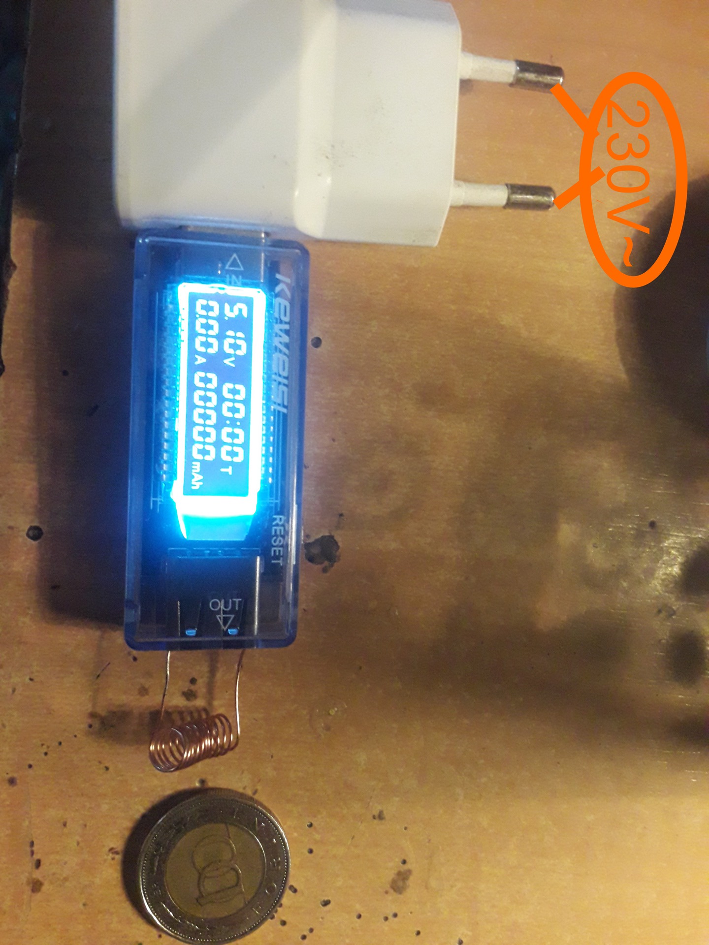 Nem lehetetlen, itt a bizonyíték. Semmi nincs megbontva, szétszedve, elrejtve a képen. Megfelelő menetszámú tekercs, megfelelő huzal átmérő, légrés és persze a titkos tekercsnek a bekötése az USB aljzat megfelelő kivezetéseihez. A bemenet nem számít a huroktörvény értelmében az áramirány megfordul a pénzérme permeabilitásának hatására. Így a bemenetből kimenet lesz és fordítva. Hirtelen nem találtam 230V-ról működő fogyasztót, de megmértem DVM-mel. Működik. Holnap elindítom a szabadalmaztatási eljárást.