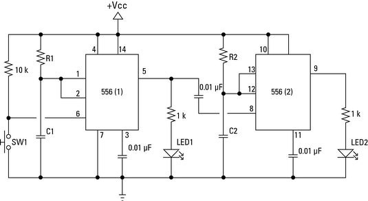 Az első 555-öt te indítod a nyomógombbal, "negatív" impulzussal. Erre időzít a kimenete és késleltetve ad a 3-as lába ugyanúgy egy "negatív" impulzust a 2. 555-nek, aminek a kimenete ott 1 secre meghúzza a relét.