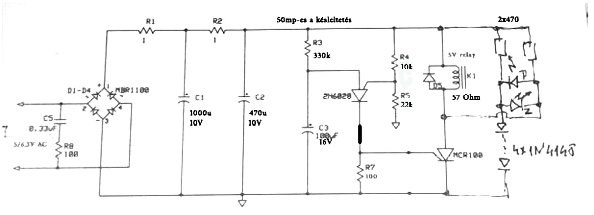 Megépítve, az első kipróbálva. A mellékelt módosításokkal csináltam meg, az időzítés 50 mp-re adódott. Természetesen ugyanezt feszültség kétszerezős egyenirányítással, nagyobb feszültségre készült kondenzátorokkal és pl. 9V-os relével is meg lehet oldani. Számomra az előny a 6.3V AC-ről való működtetés és az egyszerűsége, valamint a fiókban található alkatrészek. A feszültség elvétele, visszaadása folytán az időzítés mindig teljes idejű.